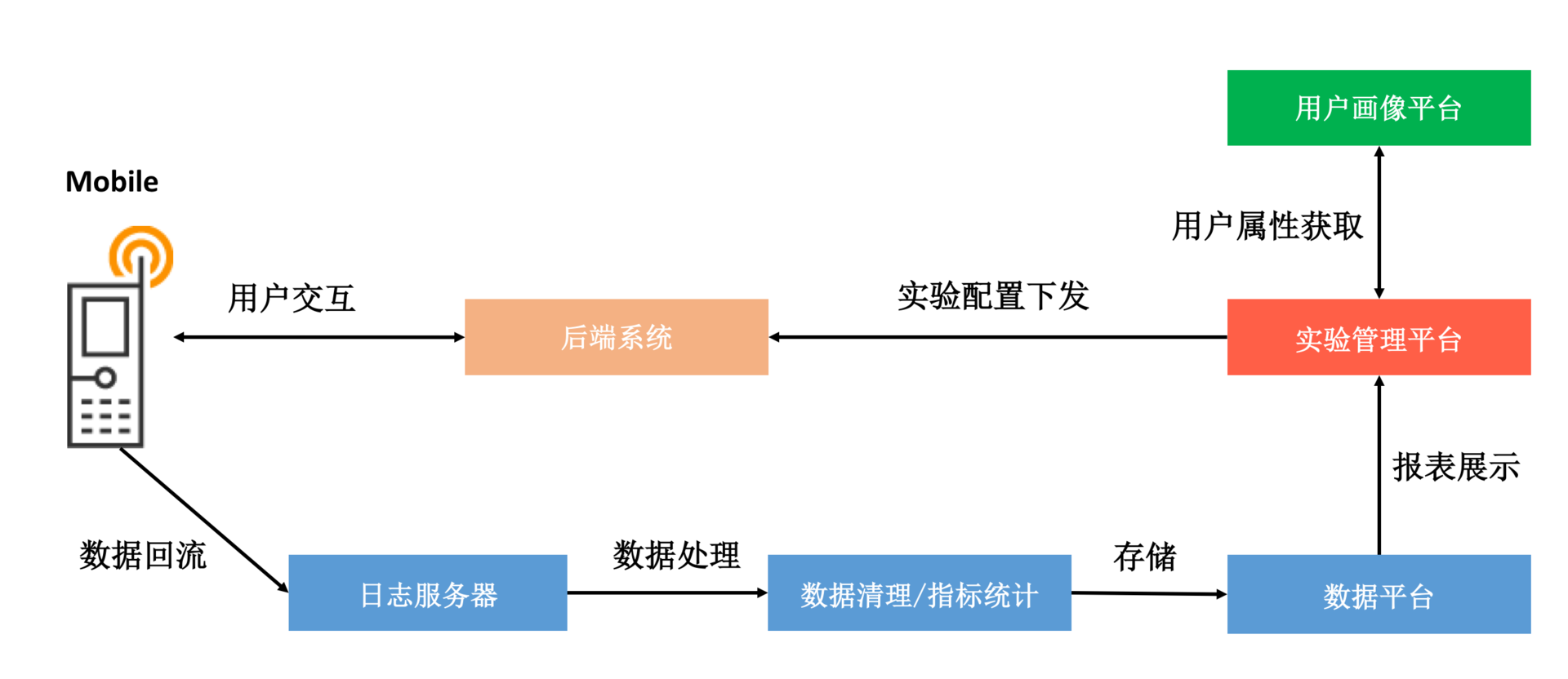 所以实现“同质同时”,并不是那么简单,首先需要丰富和精准的用户画像能力,例如版本、国家、城市、性别、年龄、喜好等用户属性。除此之外,还需要一整套强大的后台,完成测试控制、日志处理、指标计算、统计显著性指标等工作。
