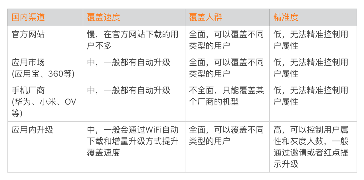 另外一方面,如果我们的灰度发布想覆盖一万名用户,那多长时间才有足够的用户下载和安装呢?渠道的能力对灰度发布效率的影响也十分巨大,在国内主要有下面几个灰度渠道。