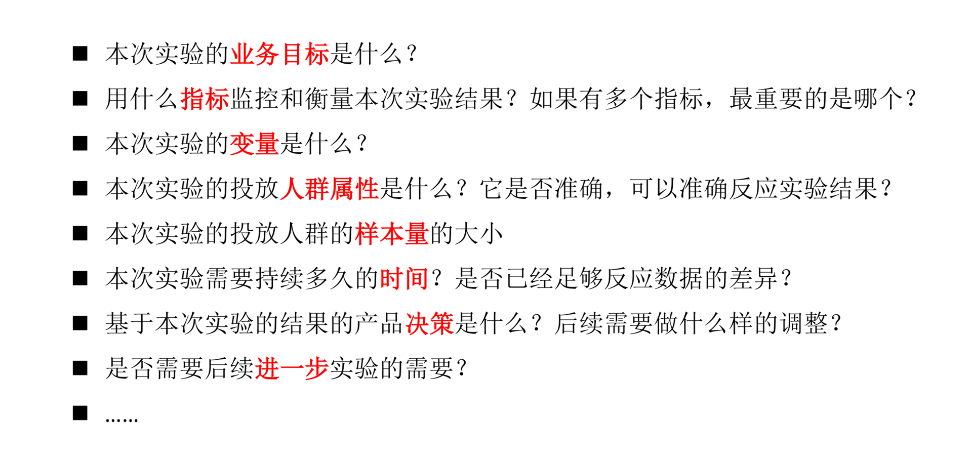 无论是研发主导的性能相关的A/B测试,还是产品主导的业务相关的A/B测试,其实很多时候都没有经过严谨的推敲,往往需要通过反反复复多次测试才能得到一个“结论”,而且还无法保证是可信的。所以无论是A/B测试,还是日常的灰度,都需要有明确的预期,真正去推敲里面的每一个环节。不要每次测试发布后,才发现实验设置不合理,或者发现这里那里漏了好几个数据打点,再反反复复进行修改,对参与测试的所有人来说都非常痛苦。