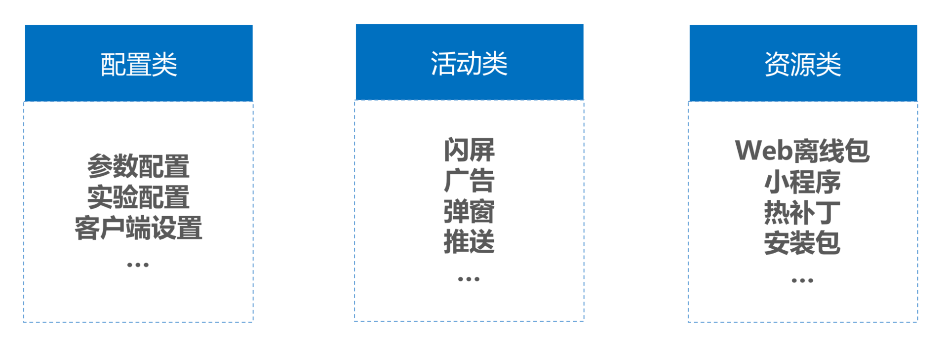 - 远程控制。在应用中,我们还需要保留一条“救命”的指令通道。通过这条通道,可以执行删除某些文件、拉取补丁、修改某些配置等操作。但是为了避免自有通道失效,这个控制指令需要同时支持厂商通道,例如某个下发资源导致应用启动后界面白屏,这个时候我们可以通过下发指令去删除有问题的资源文件。