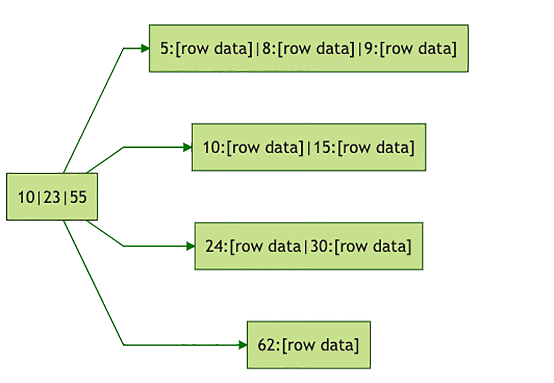 这个树以订单表的主键orders.id为关键字组织,其中“62:[row data]”,表示的是订单号为62的一行订单数据。在InnoDB中,表的索引也是以B+树的方式来存储的,和存储数据的B+树的区别是,在索引树中,叶子节点保存的不是行数据,而是行的主键值。