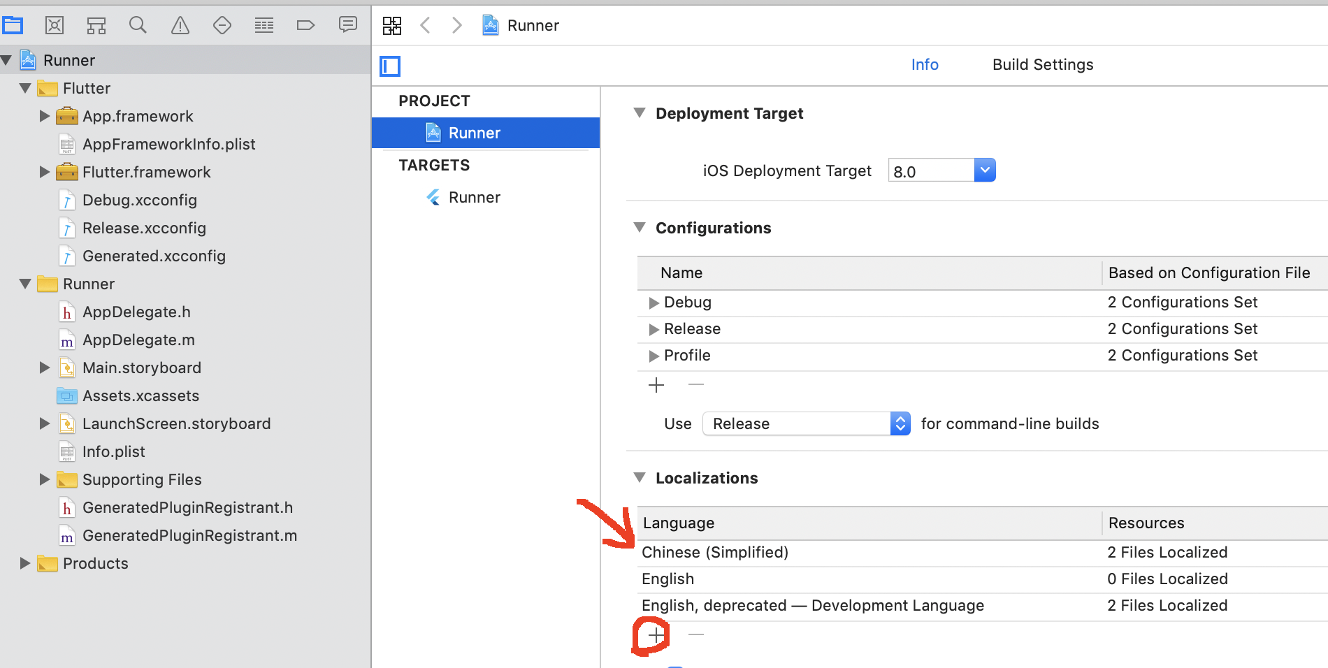 由于iOS应用程序有一套自建的语言环境管理机制,默认是英文。为了让iOS应用正确地支持国际化,我们还需要在原生的iOS工程中进行额外的配置。我们打开iOS原生工程,切换到工程面板。在Localization这一项配置中,我们看到iOS工程已经默认支持了英文,所以还需要点击“+”按钮,新增中文: