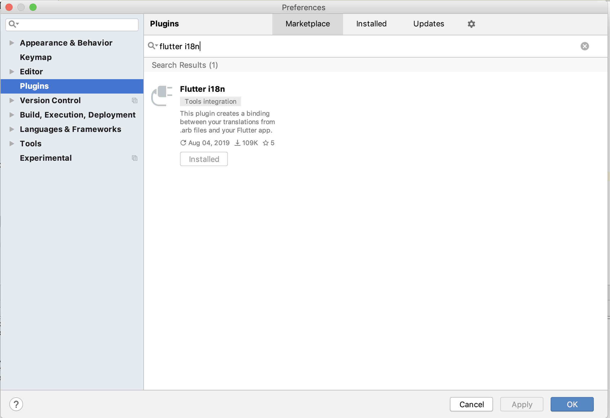 为了安装Flutter i18n插件,我们需要打开Android Studio的Preference选项,在左边的tab中,切换到Plugins选项,搜索这个插件,点击install即可。安装完成之后再重启Android Studio,这个插件就可以使用了。