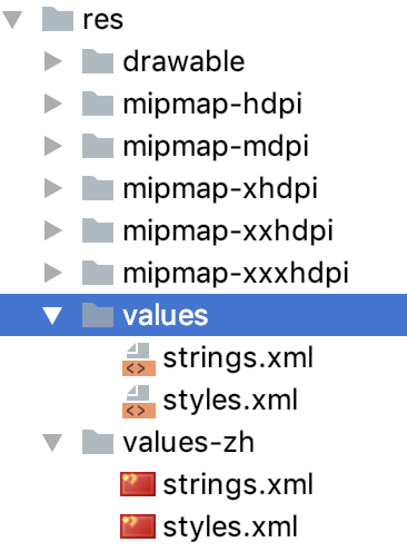 然后,我们还需要在android/app/src/main/res文件夹中,为要支持的语言创建字符串strings.xml文件。这里由于默认文件是英文的,所以我们只需要为中文创建一个文件即可。字符串资源的文件目录结构,如下图所示: