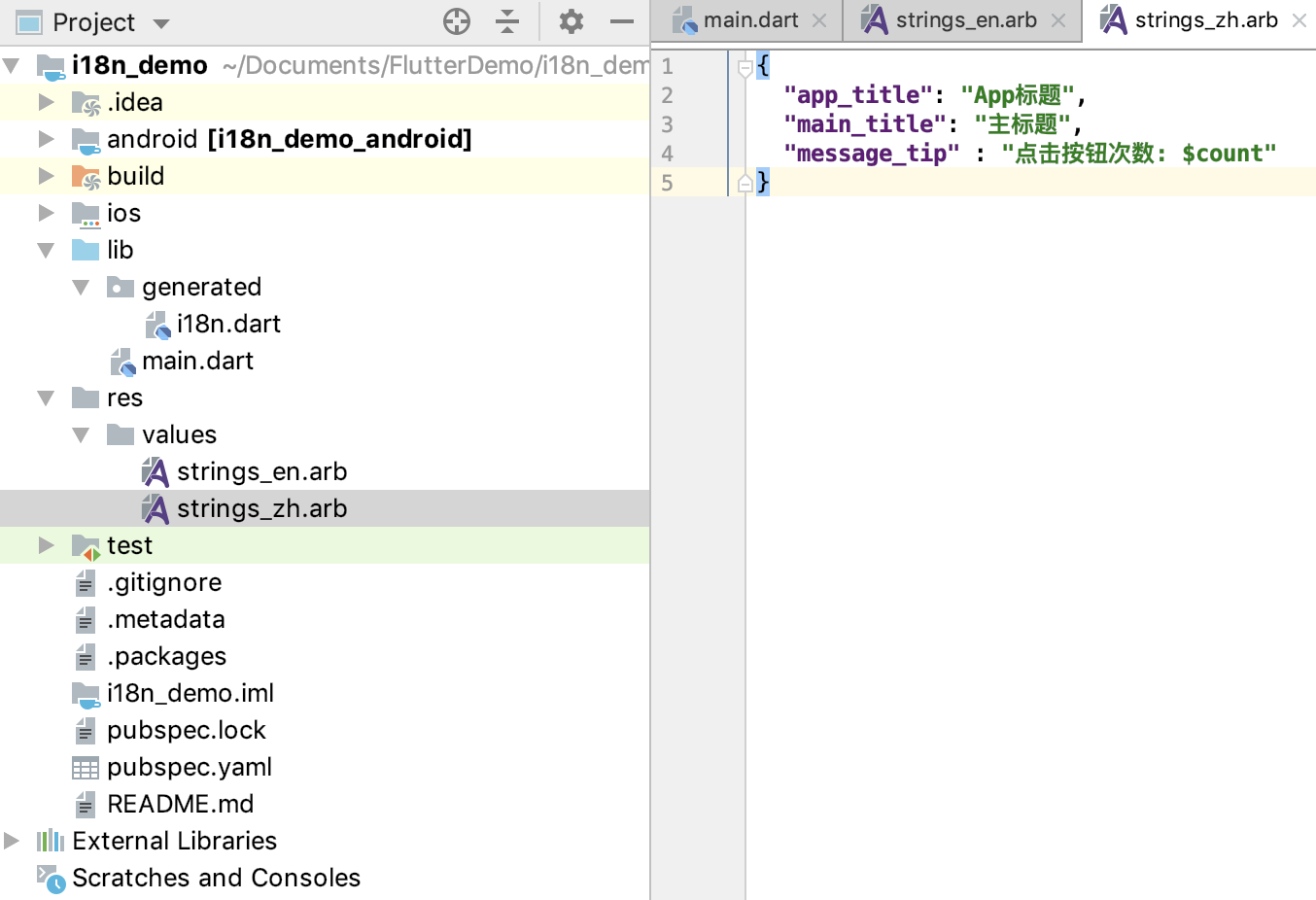 arb文件是JSON格式的配置,用来存放文案标识符和文案翻译的键值对。所以,我们只要修改了res/values下的arb文件,i18n插件就会自动帮我们生成对应的代码。