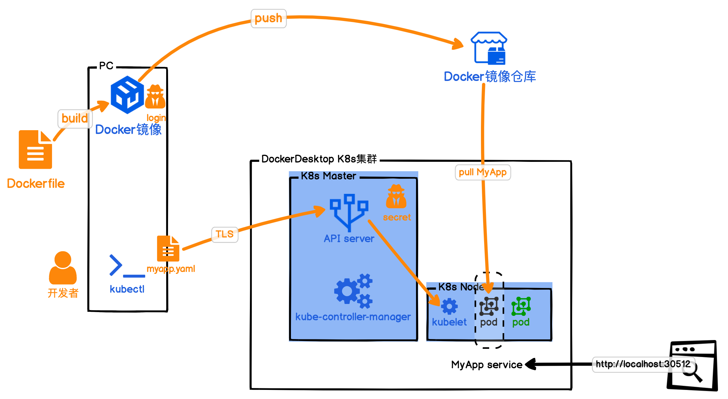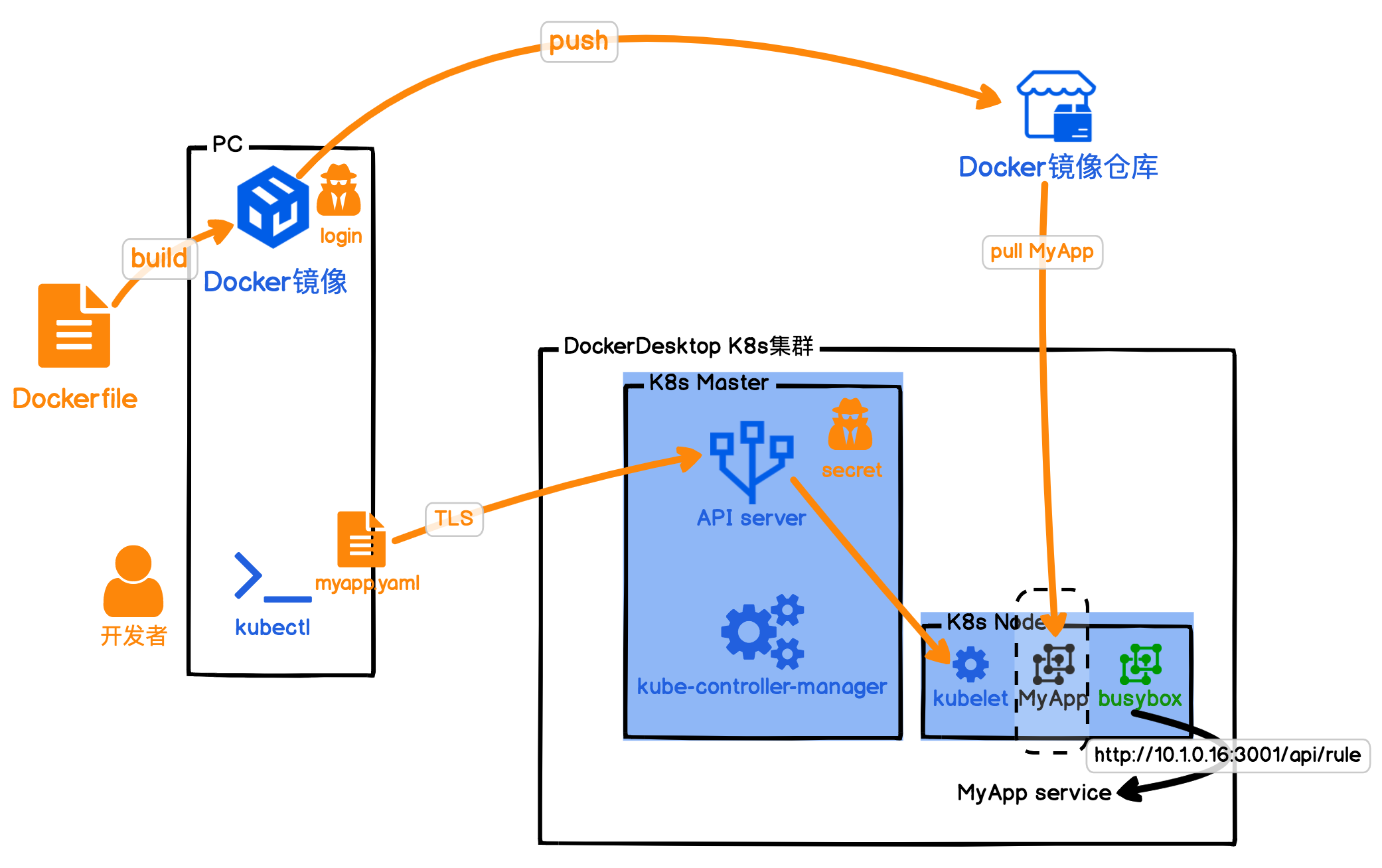 这句话的意思就是,告诉K8s集群,请按照我的部署文件myapp.yaml,部署我的应用。具体如下图所示: