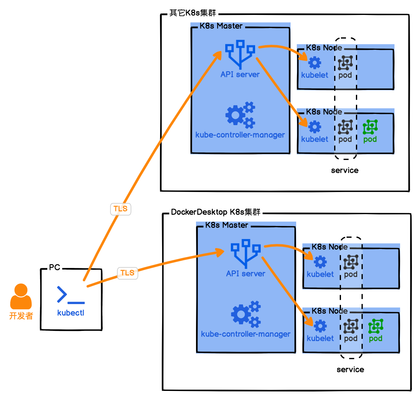 通过图示我们可以知道,PC本地安装kubectl是K8s的命令行操作工具,通过它,我们就可以控制K8s集群了。又因为kubectl是通过加密通信的,所以我们可以在一台电脑上同时控制多个K8s集群,不过需要指定当前操作的上下文context。这个也就是云原生的重要理念,我们的架构可以部署在多套云服务环境上。