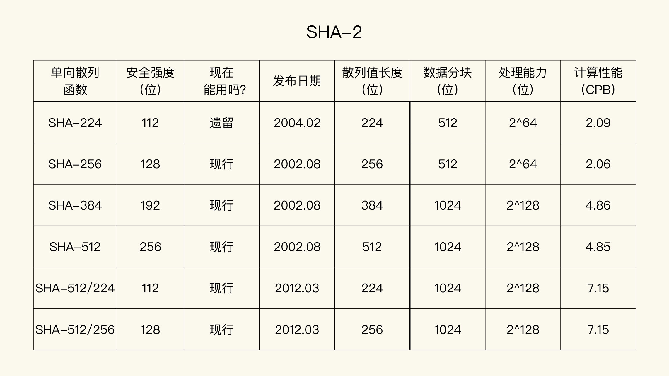 另外,计算机本身的指令集,比如是使用32位还是64位的指令,是否和算法匹配,也是影响算法性能的一个重要因素。我们经常可以看到,SHA-512的计算速度,比SHA-256还要快。SHA-256使用32位的数据进行计算,而SHA-512使用64位的数据进行计算。