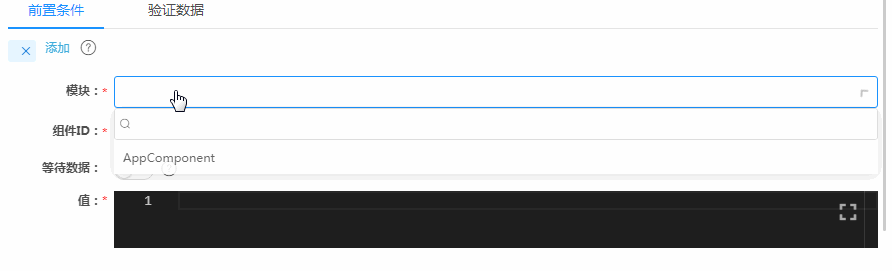 下图是我们的低代码平台Awade在这里的配置界面,主要由前置条件和验证数据两个Tab卡组成,对应着一头一尾两笔数据的配置。下面先看前置条件,也就是输入数据的配置。选定一个组件后,在“值”框里,填上预期数据,示意图中的输入数据是“江苏”,然后就没有然后了。