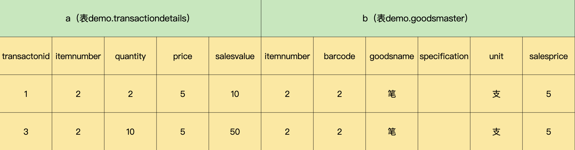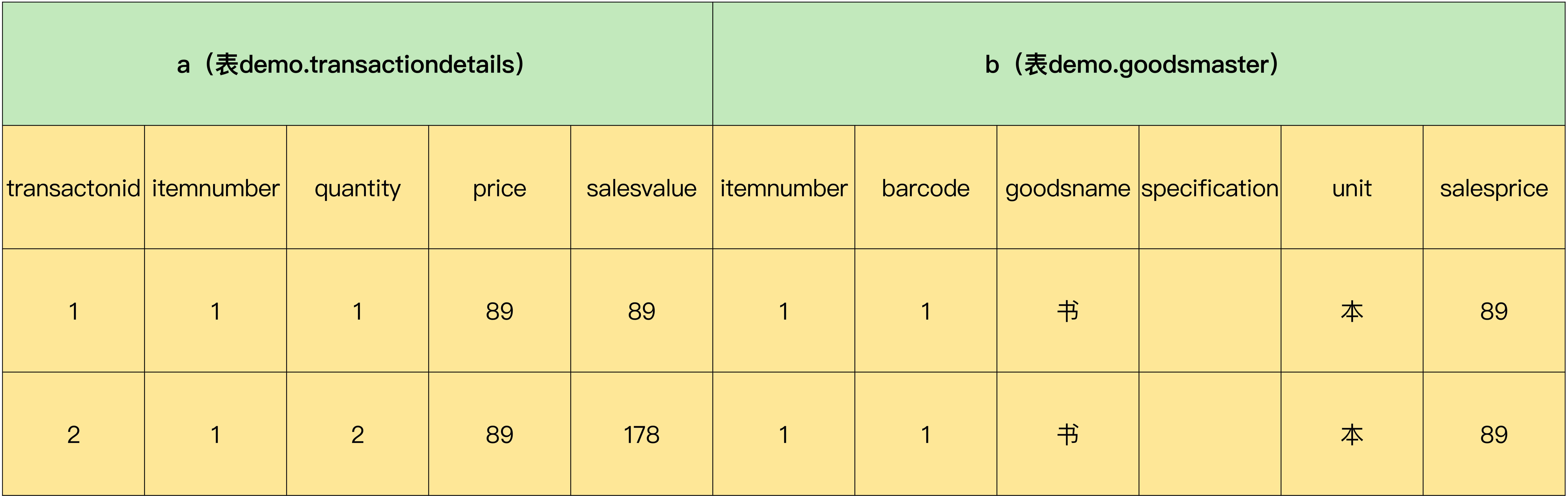 1 2 3 4 5 6 7 8 9 10 11 12 13 14 15 16 mysql> SELECT -> a.*, b.* -> FROM -> demo.transactiondetails a -> JOIN -> demo.goodsmaster b ON (a.itemnumber = b.itemnumber); +---------------+------------+----------+-------+------------+------------+---------+-----------+---------------+------+------------+ | transactionid | itemnumber | quantity | price | salesvalue | itemnumber | barcode | goodsname | specification | unit | salesprice | +---------------+------------+----------+-------+------------+------------+---------+-----------+---------------+------+------------+ | 1 | 1 | 1.000 | 89.00 | 89.00 | 1 | 0001 | 书 | NULL | 本 | 89.00 | | 1 | 2 | 2.000 | 5.00 | 10.00 | 2 | 0002 | 笔 | NULL | 支 | 5.00 | | 2 | 1 | 2.000 | 89.00 | 178.00 | 1 | 0001 | 书 | NULL | 本 | 89.00 | | 3 | 2 | 10.000 | 5.00 | 50.00 | 2 | 0002 | 笔 | NULL | 支 | 5.00 | +---------------+------------+----------+-------+------------+------------+---------+-----------+---------------+------+------------+ 4 rows in set (0.00 sec)
