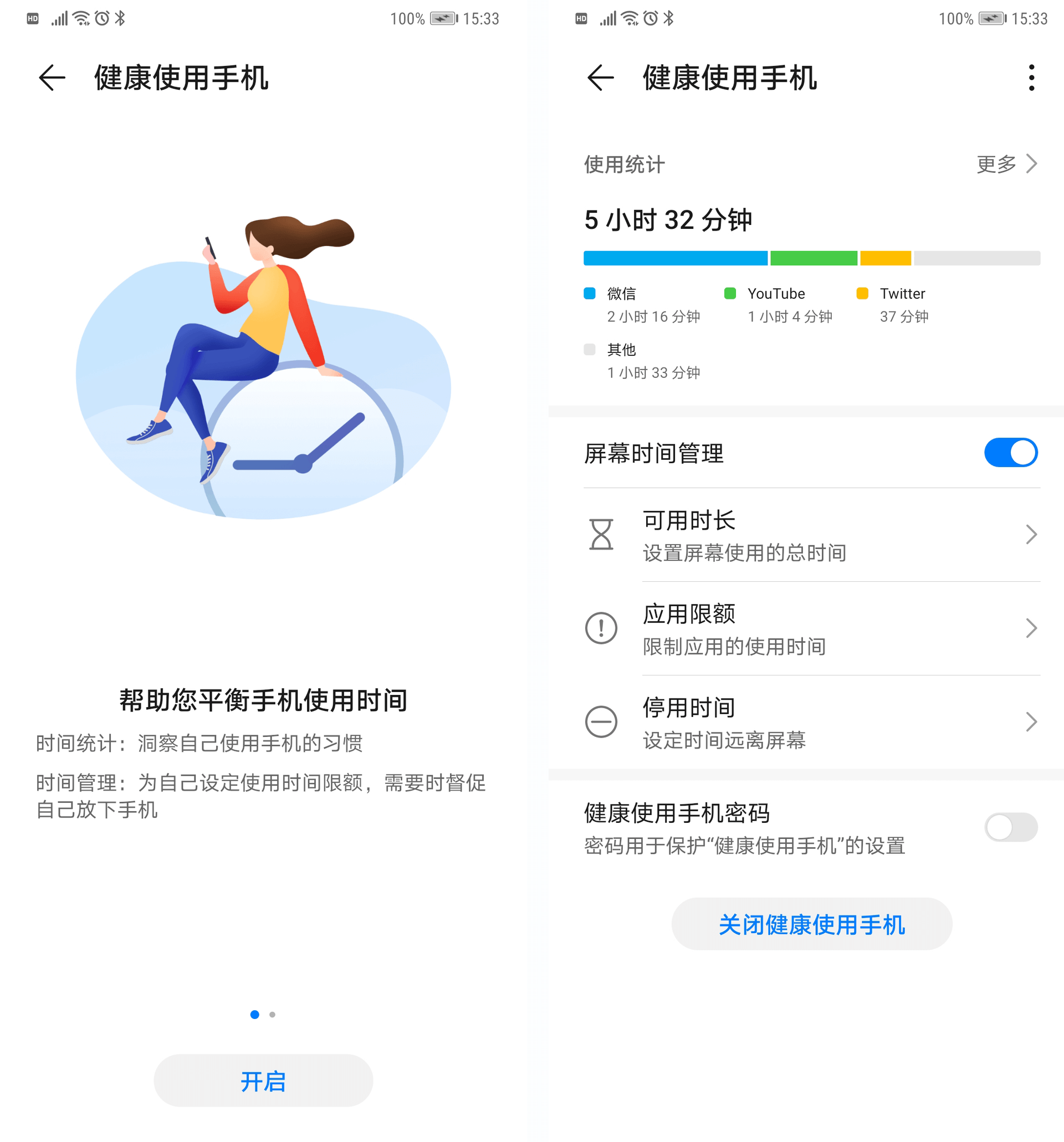 现在很多手机厂家都有健康使用手机的功能设置。你可以在健康使用手机模式里对使用时长、应用限额、应用种类等做一个自我约束计划。在达到限额后不可用的应用图标会变灰。你也可以通过延时使用做临时的妥协,但提供的延时时长较短,延时到期后的提醒会进一步增加你不遵守承诺的压力。这样一来,我们在大部分时间里会去遵守我们做出的健康使用手机的承诺。