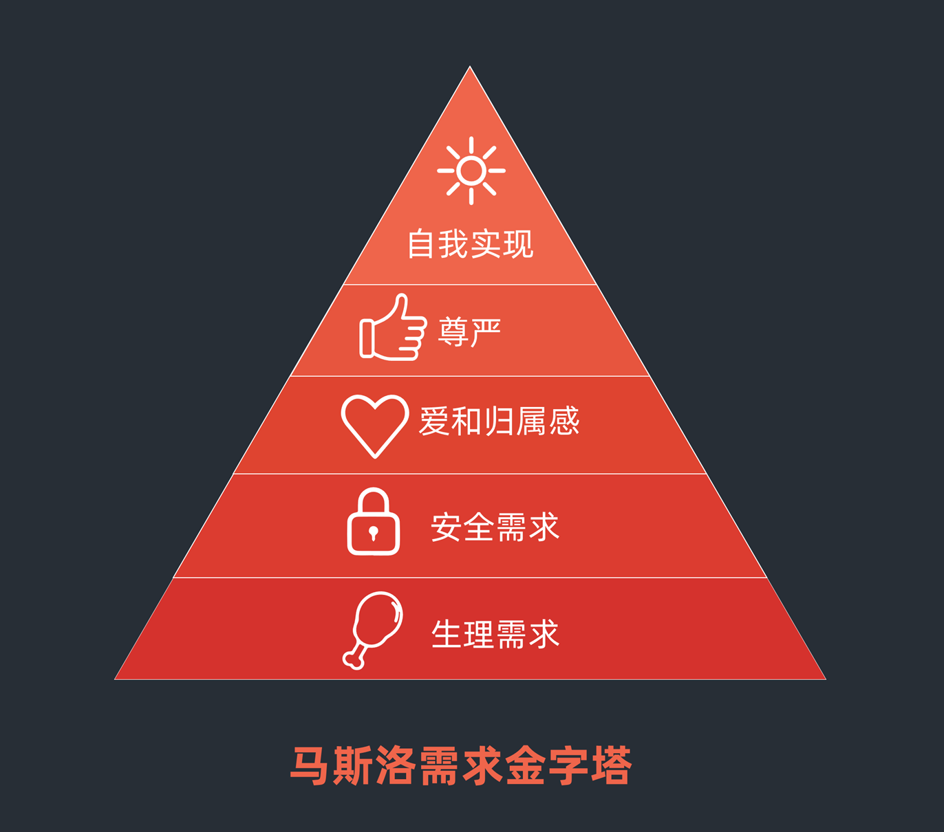 经典的马斯洛需求金字塔模型认为人有六个层次的需求:生理需求、安全需求、社交需求、尊重需求、自我实现需求以及超我需求。这六个层次需求,是一个由低到高逐级形成并逐级得以满足的。