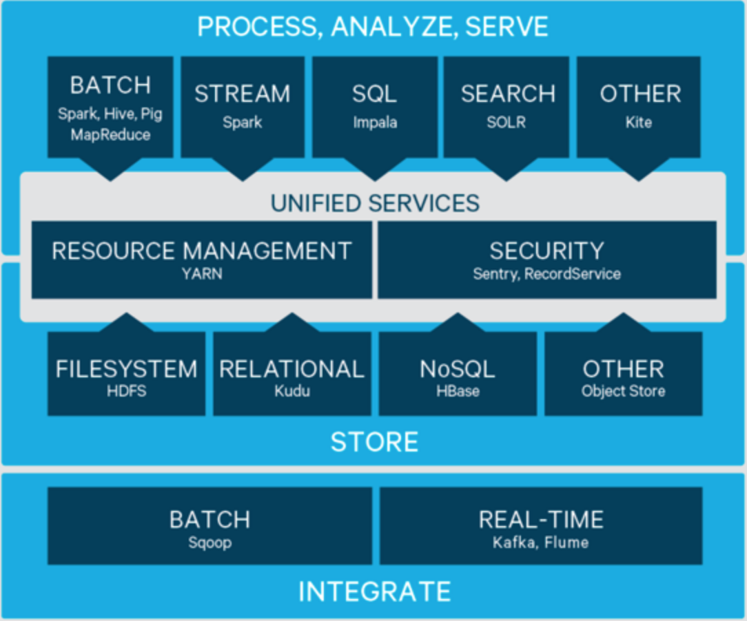 CDH是一个大数据集成平台,将主流大数据产品都集成到这个平台中,企业可以使用CDH一站式部署整个大数据技术栈。从架构分层角度,CDH可以分为4层:系统集成,大数据存储,统一服务,过程、分析与计算。