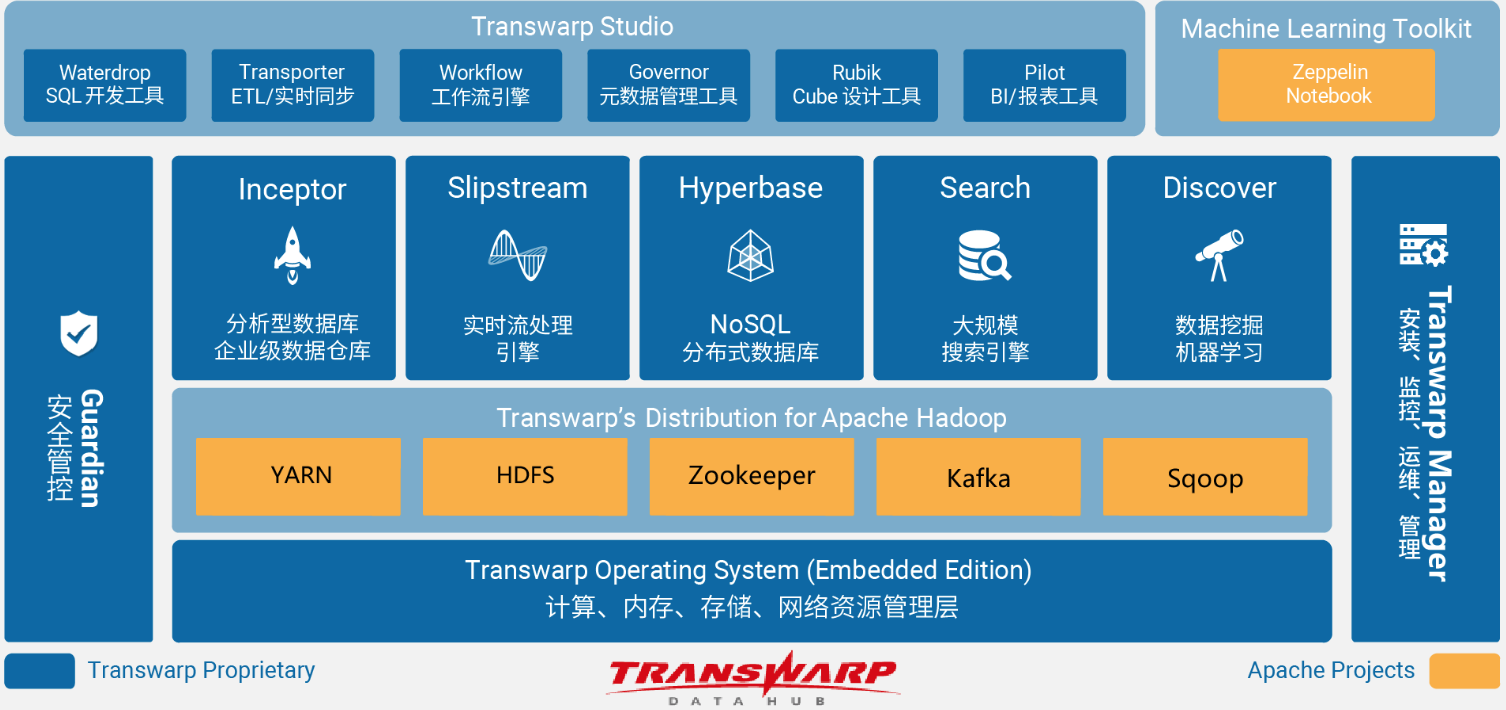 国内本土和Cloudera对标的公司是星环科技,商业模式和Cloudera一样,主要是为政府和传统企业向大数据转型过程中提供技术支持服务。核心产品是类似CDH的TDH,如下图所示。