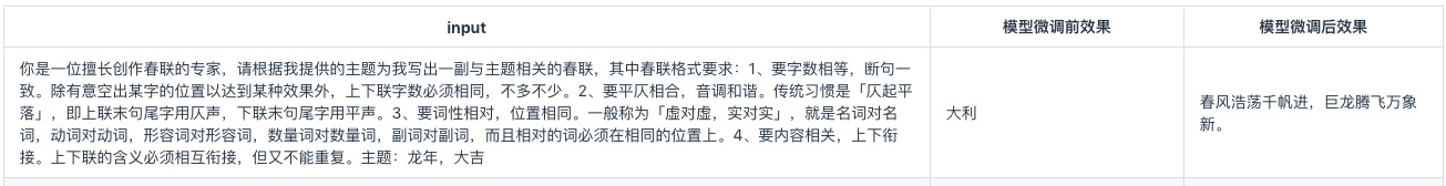 我只要把全部的春联数据整理成这3段的格式就可以了,我们看看微调前后的效果对比。
