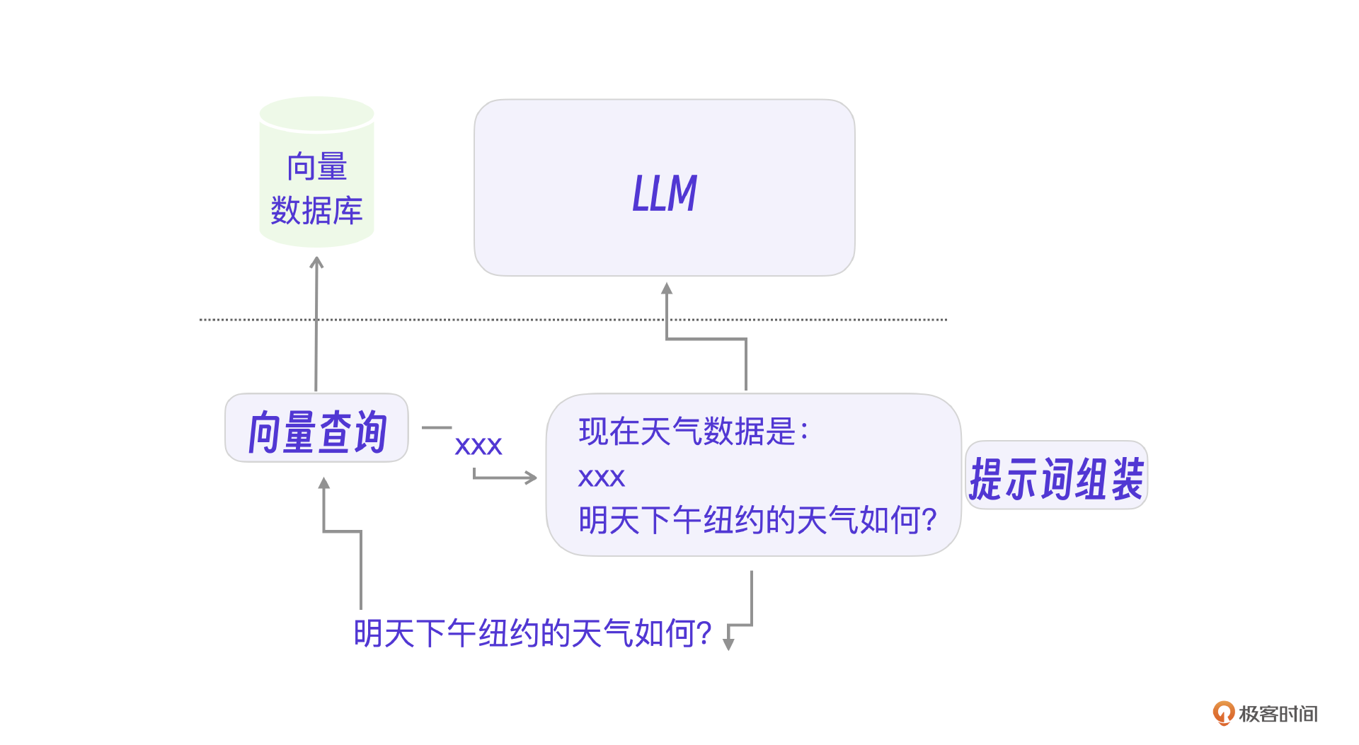 以一个天气查询的AI应用来说明向量数据的应用。比如,现在用户的提问了,问:明天下午纽约的天气如何?