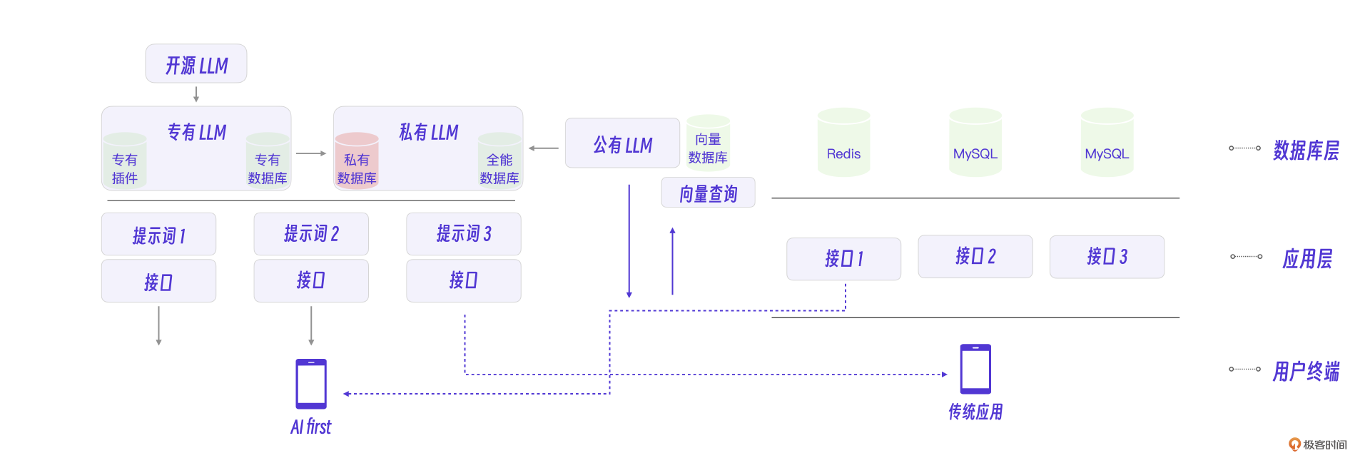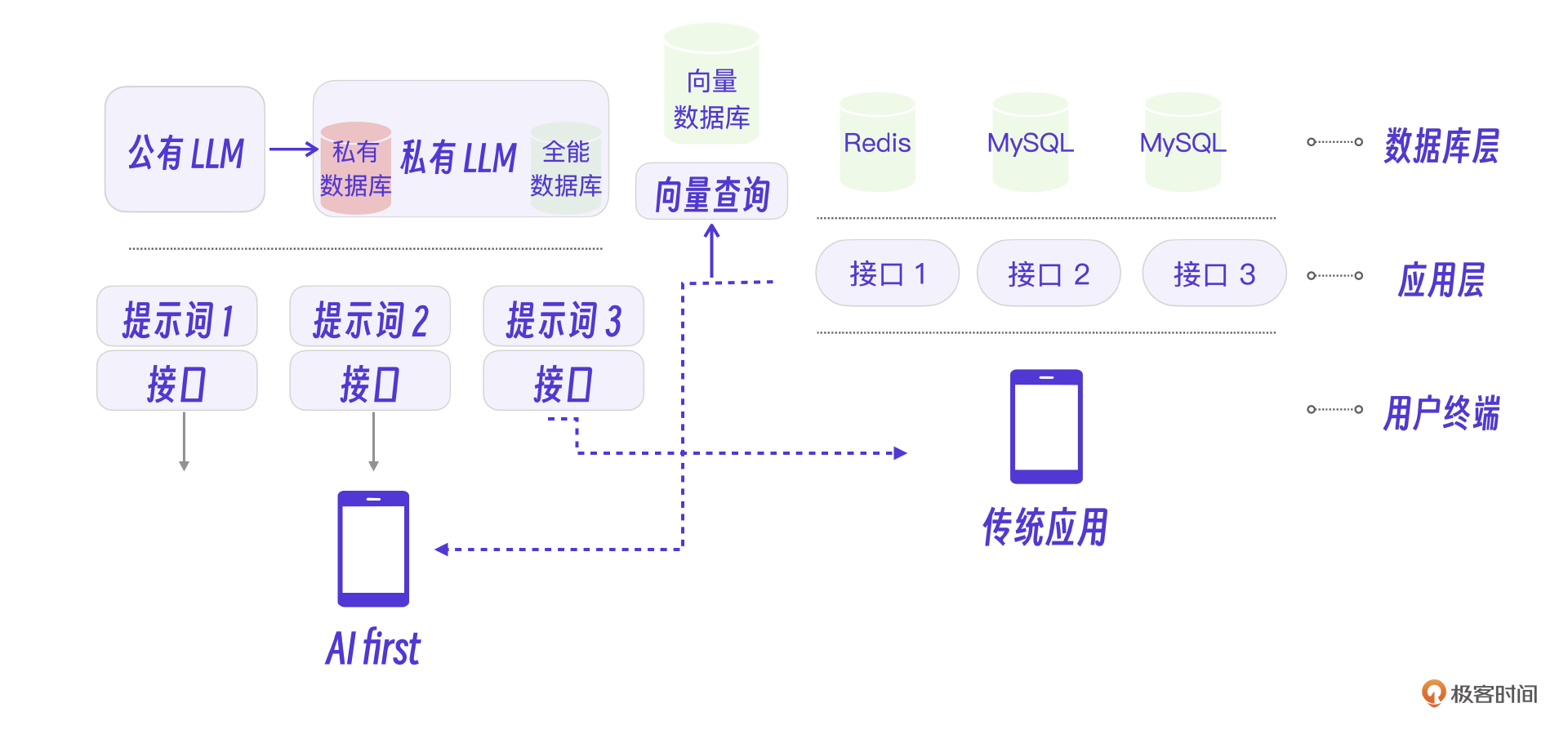 回顾一下最终整理的大模型AI智能体应用开发架构图,我们会发现传统互联网架构、传统应用、大模型、提示词、微调、AI first应用之间的关系其实是比较清晰的。从分层的角度对比来看,AI大模型和数据库是一层的,提示词和传统接口是一层的,AI应用属于应用层。