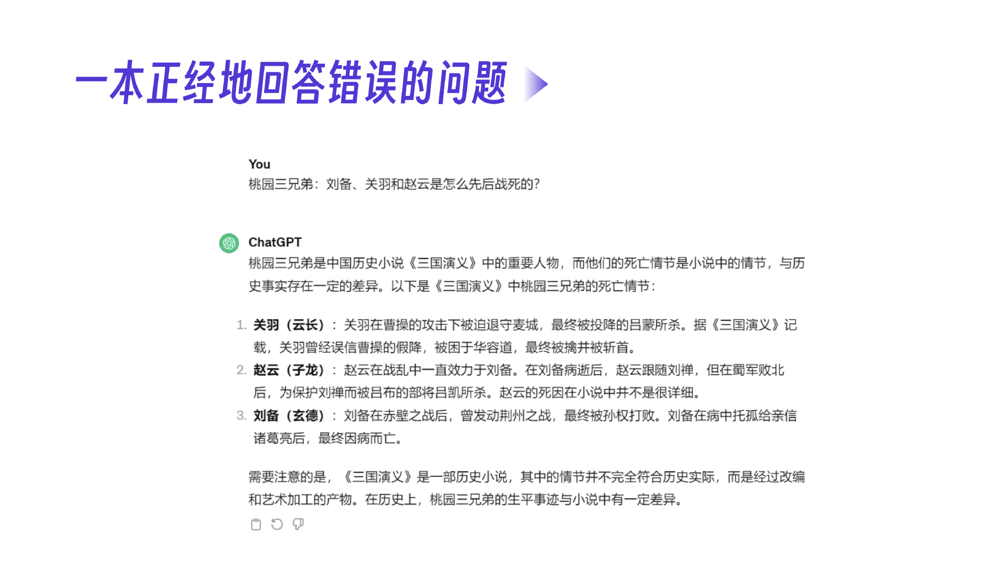 接触过一些大模型知识的朋友都听过一个词,大模型幻觉,指的是大模型有一定概率会胡编乱造。比如你问它桃园三兄弟“刘备、关羽、赵云”是怎么先后战死的啊?很明显,这问题就是错误的。但是大模型还会沿着错误一本正经地发挥。
