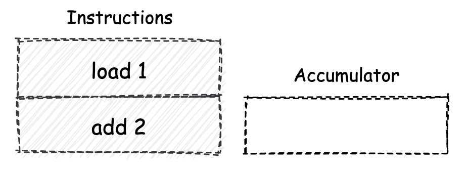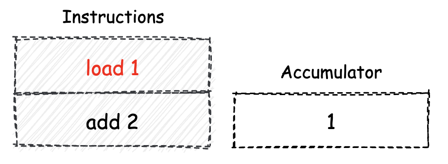 初始状态时,累加器中没有任何数据。接下来,指令按照类似从上到下的顺序开始执行。第一条指令 “load” 会将其后面跟随的立即数(根据指令设计不同,后面也可能会跟随一个线性内存的地址)放到累加器中。当该条指令执行完毕后,累加器机的整体状态如下图所示。