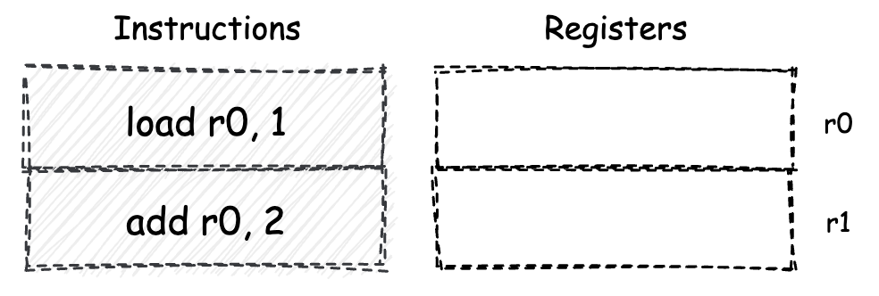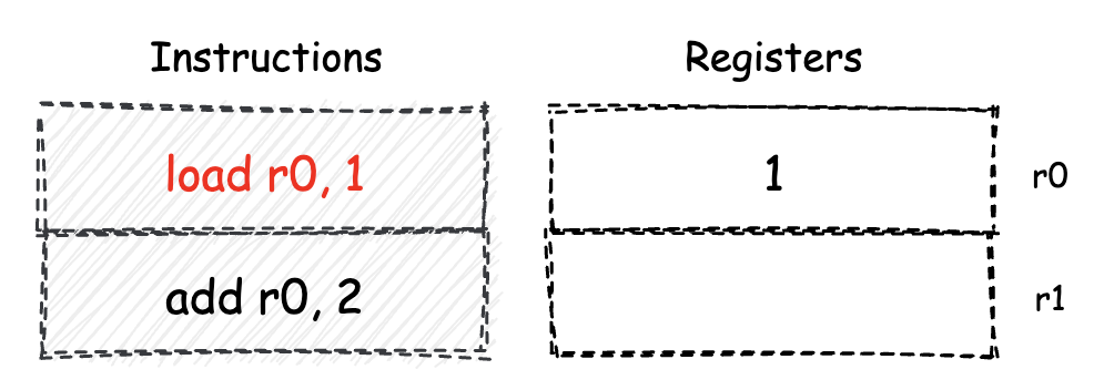 第一条指令 ”load r0, 1“。load 指令将接受两个操作数。第一个为目标寄存器的别名,第二个为一个立即数。当指令执行时,作为第二个操作数的立即数,将会被存放到由第一个操作数指定的寄存器中。该指令执行完毕时,对应的寄存器机整体状态如下图所示。此时,寄存器 r0 中存放有数值 1,而寄存器 r1 中没有存放任何内容。