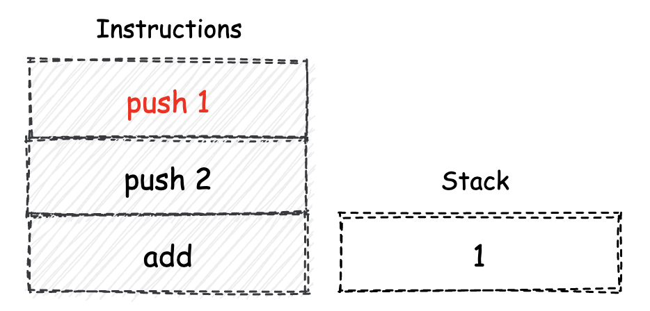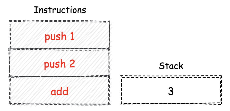 接下来,我们将尝试模拟堆栈机的实际运行流程。在这个过程中,我们会使用到一些简单的指令,比如 “push”,“pop” 与 “add” 等等。这里你可以把它们想象成一种汇编指令。