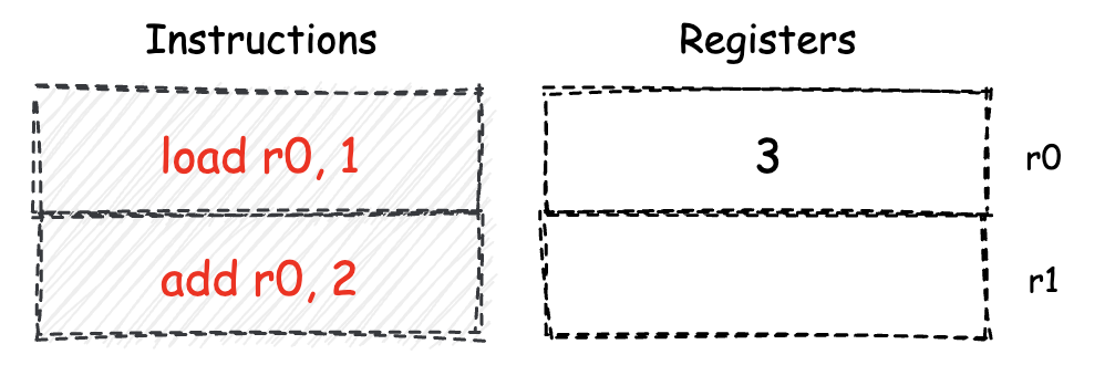 接下来第二条指令。与第一条指令类似,我相信你已经能够猜测出它的作用。这条 “add” 指令会将作为第二个操作数的立即数累加到,由第一个操作数所指定的寄存器中。当指令全部执行完毕后,对应的寄存器机终态将如下图所示。此时,寄存器 r0 中存放有表达式 “1 + 2” 的计算终值 “3”,而寄存器 r1 中仍然没有存放任何内容。