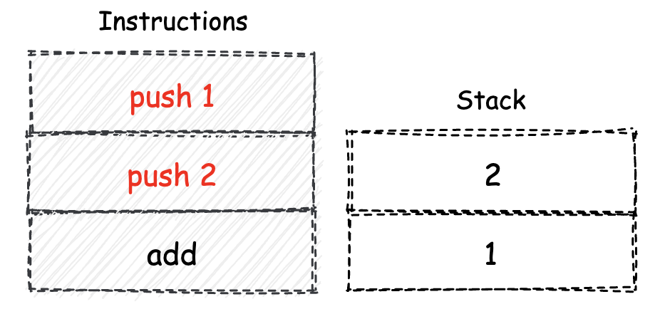 可以看到,目前栈容器中存放有通过前两条 push 指令压入的操作数 “1” 和 “2”。接下来,堆栈机继续执行第三条 “add” 指令。