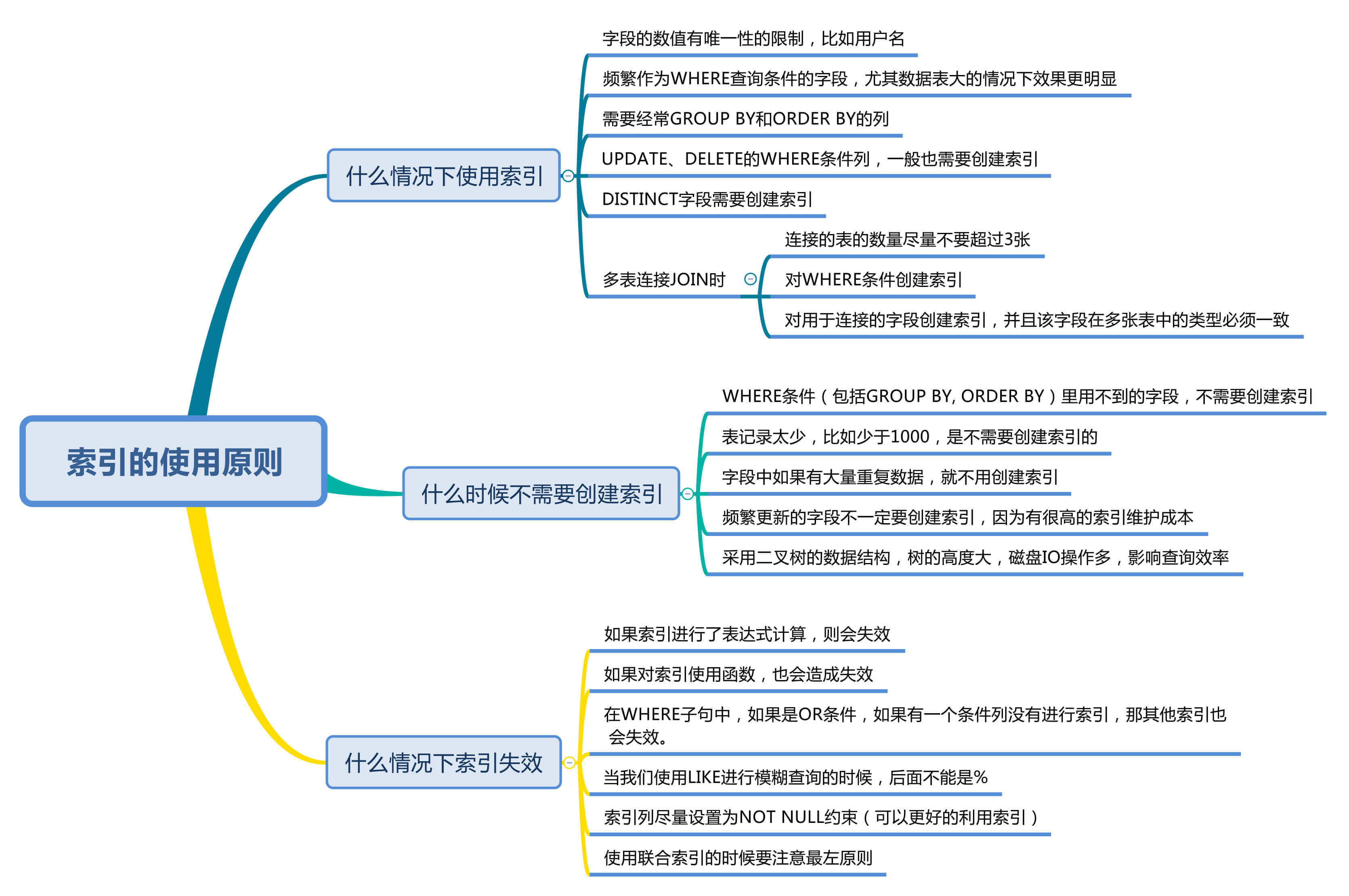 最后一种情况是,频繁更新的字段不一定要创建索引。因为更新数据的时候,也需要更新索引,如果索引太多,在更新索引的时候也会造成负担,从而影响效率。