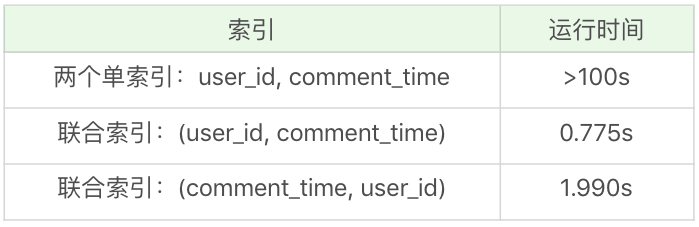 实际上多个单列索引在多条件查询时只会生效一个索引(MySQL会选择其中一个限制最严格的作为索引),所以在多条件联合查询的时候最好创建联合索引。在这个例子中,我们创建联合索引(user_id, comment_time),再来看下查询的时间,查询时间为0.775s,效率提升了很多。如果我们创建联合索引的顺序为(comment_time, user_id)呢?运行时间为1.990s,同样比两个单列索引要快,但是会比顺序为(user_id, comment_time)的索引要慢一些。这是因为在进行SELECT查询的时候,先进行GROUP BY,再对数据进行ORDER BY的操作,所以按照这个联合索引的顺序效率是最高的。