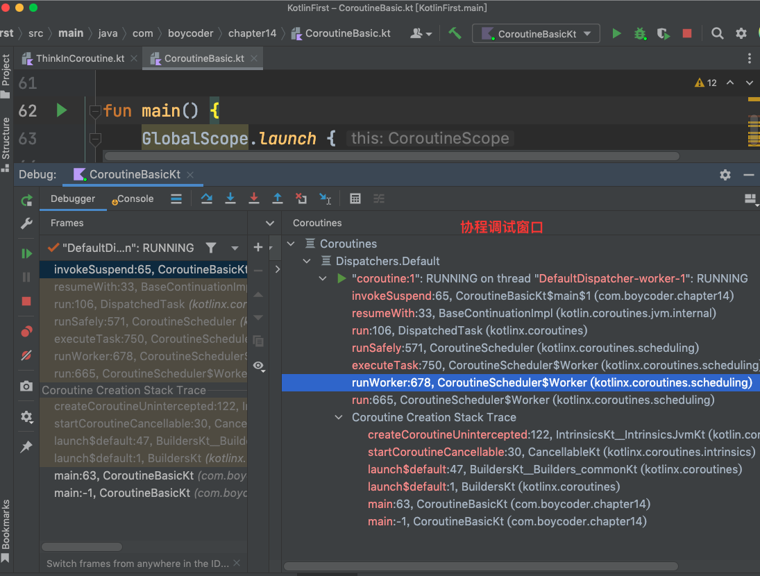 除了设置VM参数之外,我们还可以直接使用IDE的调试功能,直接以打断点的形式来调试协程。具体来说,主要有这样几个注意事项。