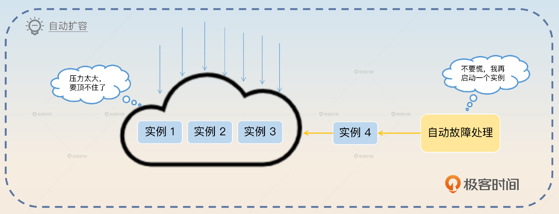 这里我给你一个例子:微服务集群自动扩容。它是指对整个微服务集群进行监控,如果发现集群负载过高那么就会自动扩容。