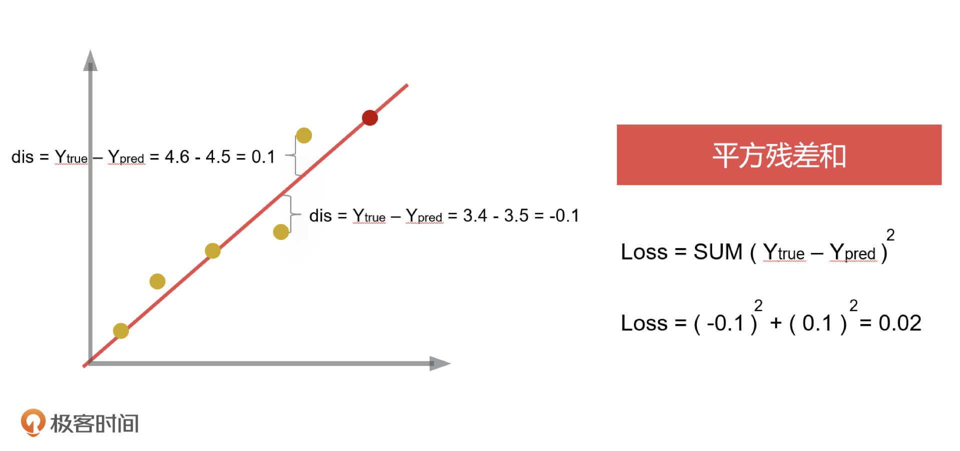 这个公式在机器学习中就被称作损失函数,也叫代价函数。**损失函数就可以用来评价模型的预测值和真实值之间不一样的程度,损失函数值越小,模型性能越好。**而平方残差和(RSS,Residual Sum of Squares)是一种最常见的损失函数,它可以用来计算每一个样本点的结果值和当前函数值之间的平方差,差值越小,回归模型做得就越好。差值的具体计算方式,我们只要了解就可以了,我把相应的图片放在了下面,你可以看一看。