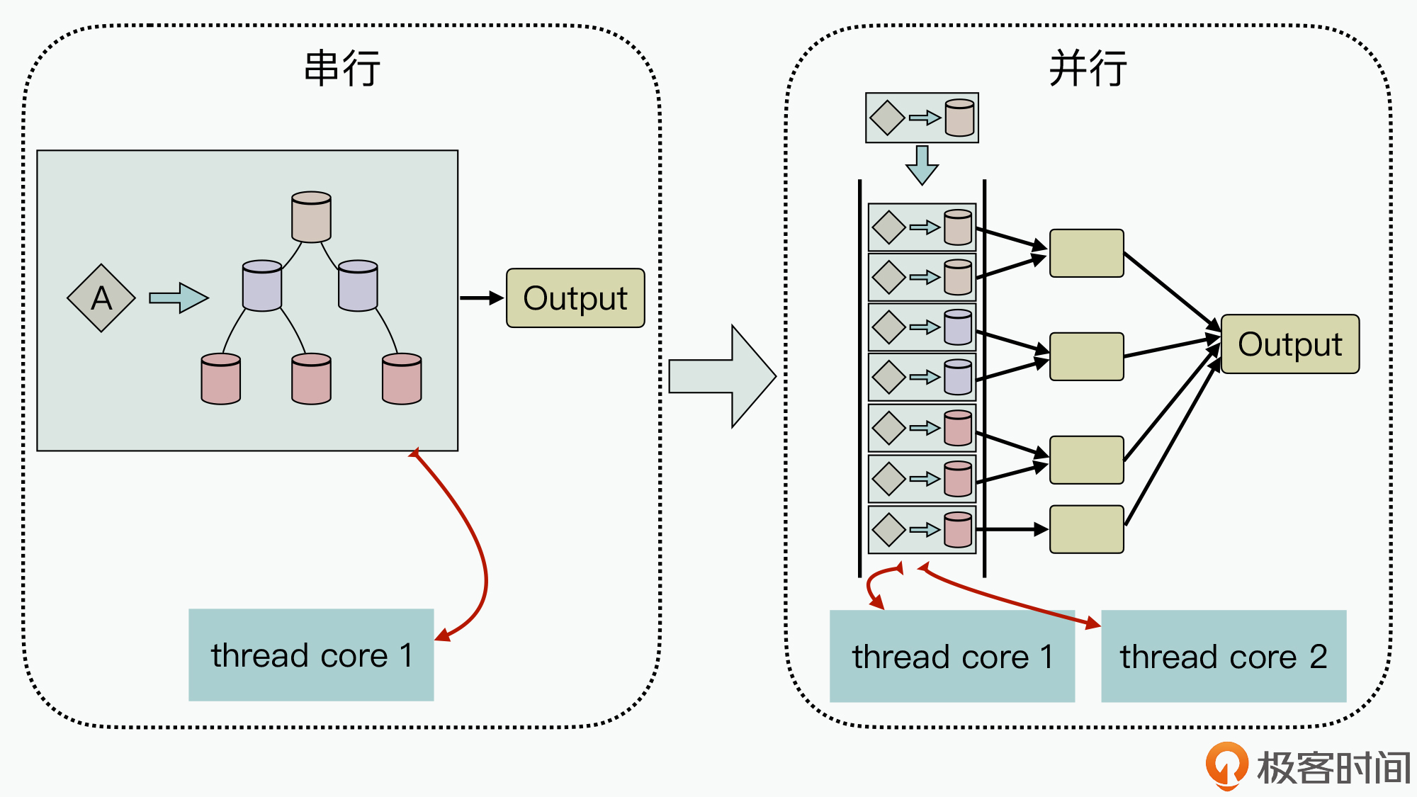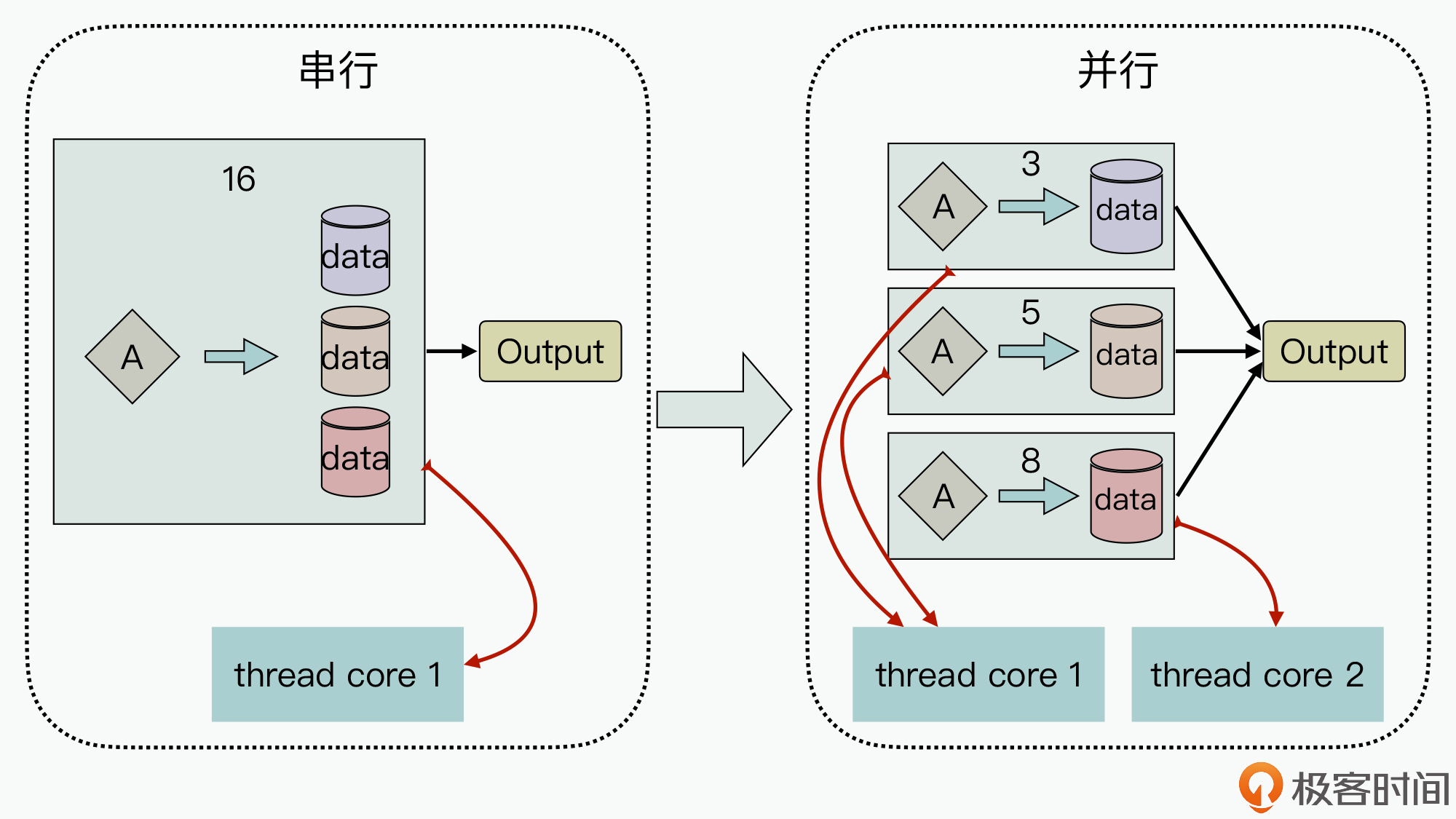 这里你要注意的是,图中的两个并行执行单元代表了抽象的逻辑单元,并不是特指线程。并行执行单元的粒度可大可小,像函数、routine(协程)、actor、线程、进程、作业等,都可以作为并行执行单元。