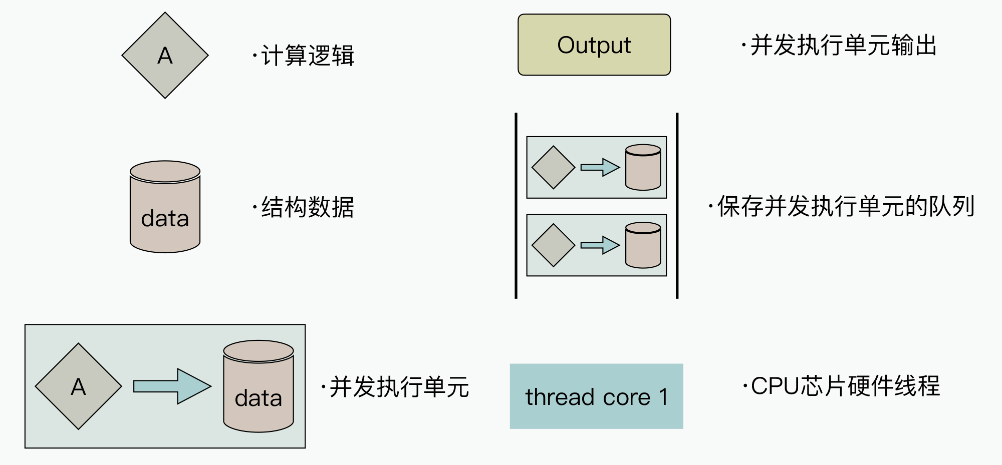 所以,你在学习这6种并⾏架构模式时,就需要了解这种架构的核⼼关注点是什么,以及它重点解决了什么问题。为了便于你理解后面会用到的几种并行架构设计的图例,这里我先说明一下图中各种元素的含义: