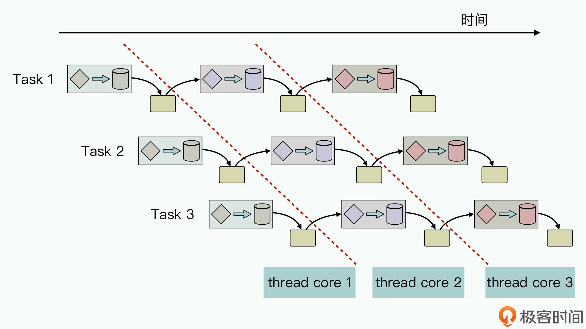 不过在Java语言中,也不是只能使用这种抽象粒度的并行执行单元来实现并行设计。Java中还有诸如Akka、Reactor等并发调度框架底座,来支撑更加轻量级的并行执行单元。比如,你可以使用Akka中的Actor进行并行系统设计,也可以基于Reactor库设计和实现并发程序,你甚至可以为特定应用场景专门定制并发调度底座。