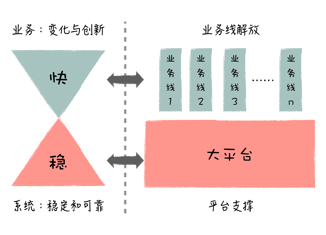 这里,我们把业务平台和业务线剥离开,让业务平台封装基础通用的功能,这样,它就变得相当地稳定;让各个业务线包含自己的个性化需求,业务线只依赖业务平台,业务线彼此之间互相独立,可以自由变化。这样的业务架构设计,就同时保证了系统的相对稳定和业务的快速创新。