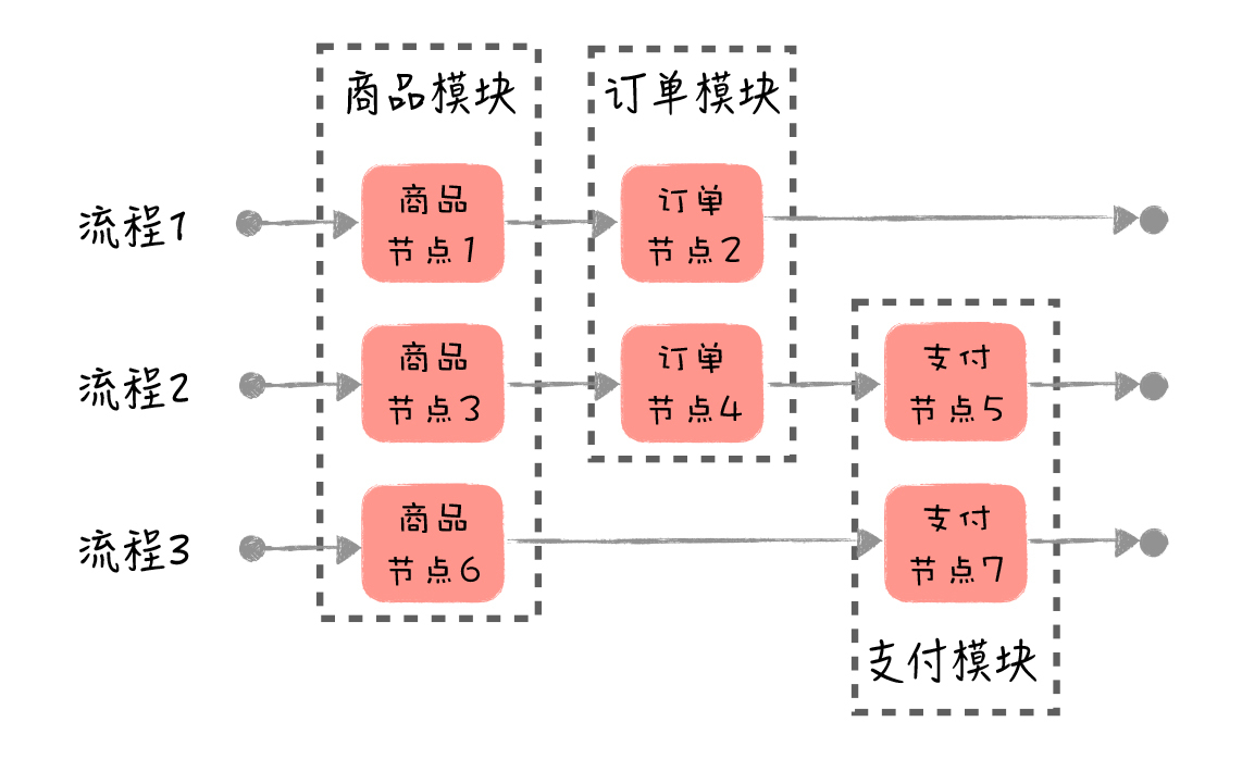 在实际业务场景中,一个业务节点可能会涉及不同业务领域的功能。比如说,一个下单节点,会涉及到获取商品信息、获取用户信息、扣库存、下订单等多个业务功能,那么你就可以进一步分解这个节点的功能,把不同的功能分到对应的业务域和系统模块。