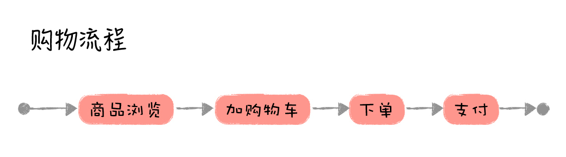 基于业务域,构建了系统模块后,我们就可以按照这样的方式还原整个业务流程,比如上面的购物流程例子,我们就可以这样还原它: