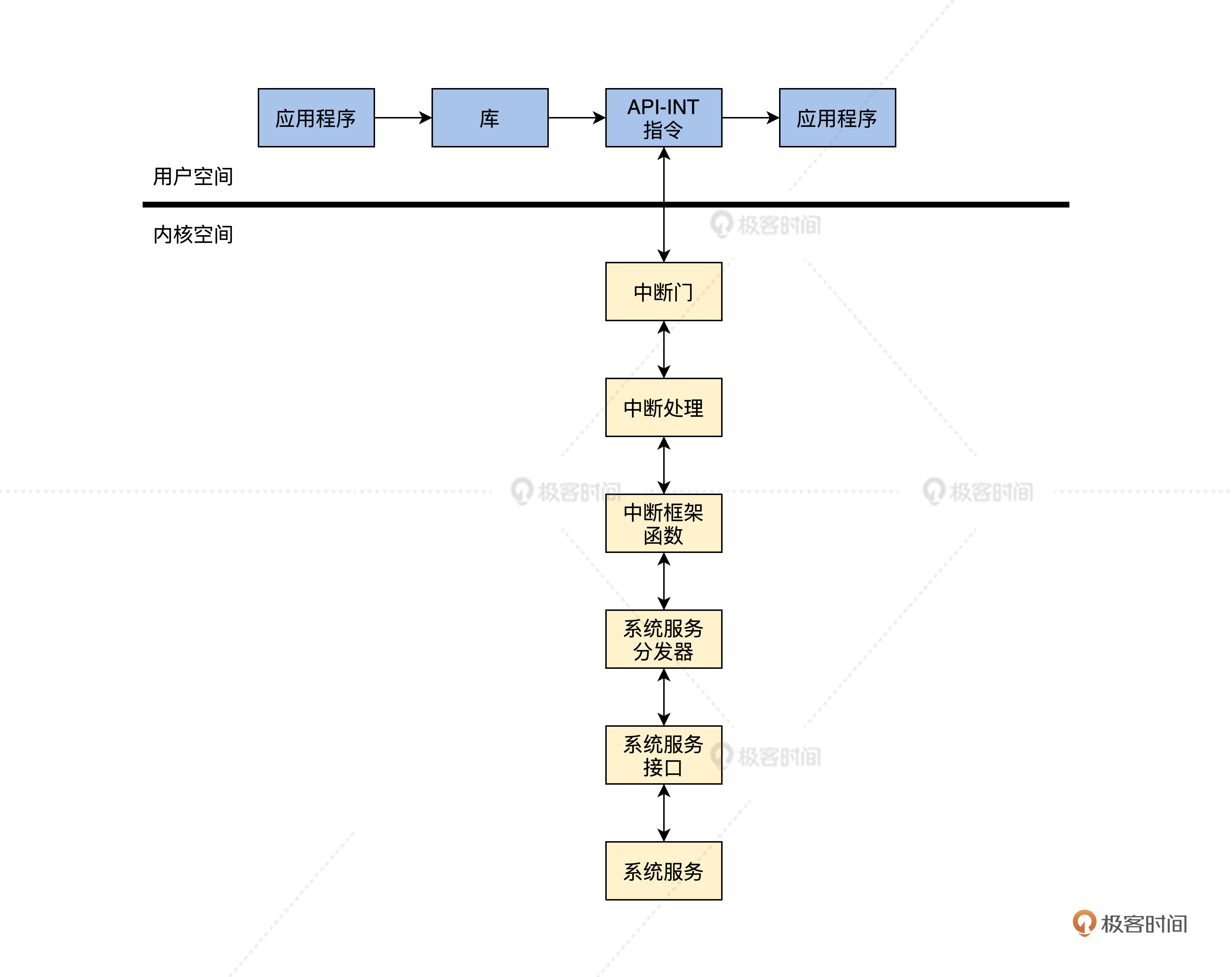 我们已经实现了一个获取时间的系统服务函数,我想你应该能自己实现其它更多的系统服务函数了。下面我来帮你梳理一下,从库函数到进入中断再到系统服务分发器,最后到系统服务函数的全过程,我给你准备了一幅图,如下所示。