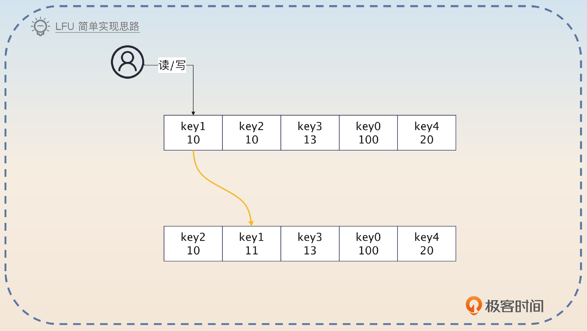 如果有好几个对象的访问频次恰好相等,而且又是最低的,那么你可以自由决策如何淘汰。标准做法是淘汰最先插入的,不过也有一些实现就是随机删一个,又或者删掉排序位置最小的那个。实现的基本思路就是每次读写的时候,对象上面的次数都加 1,然后调整位置。