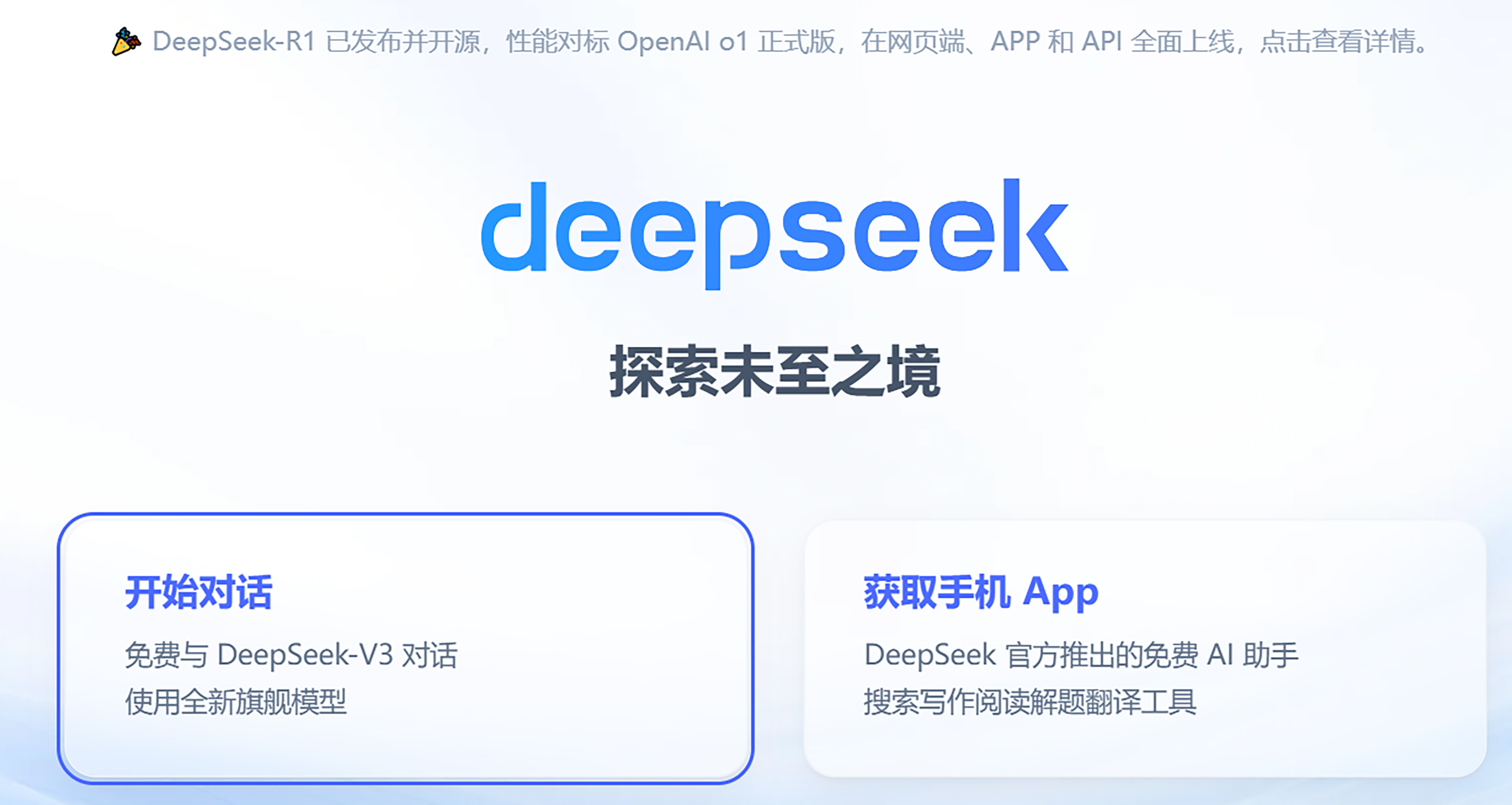我们这就来看看 DeepSeek 如何使用。如果想先体验一下模型的能力,我们可以直接去官网(DeepSeek | 深度求索),点击开始对话,就可以免费体验官方版本的 DeepSeek-V3 以及满血版 671B 的 DeepSeek-R1 的能力。