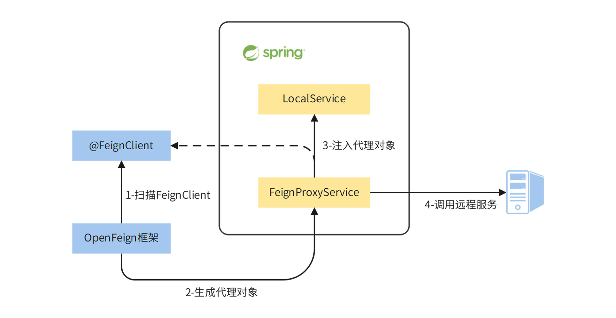 最后,LocalService会发起底层方法调用。实际上这个方法调用会被OpenFeign生成的代理对象接管,由代理对象发起一个远程服务调用,并将调用的结果返回给LocalService。