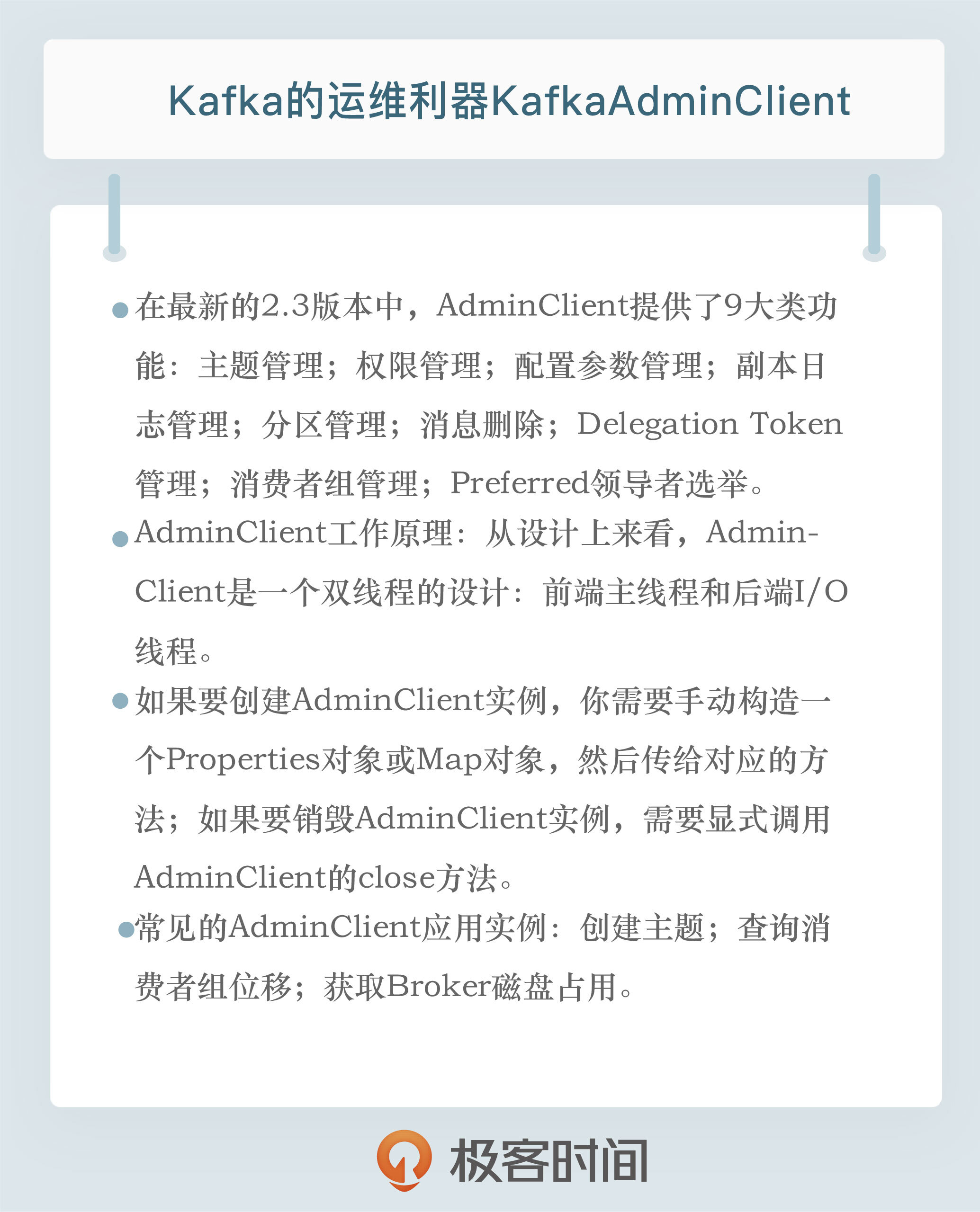 好了,我们来小结一下。社区于0.11版本正式推出了Java客户端版的AdminClient工具,该工具提供了几十种运维操作,而且它还在不断地演进着。如果可以的话,你最好统一使用AdminClient来执行各种Kafka集群管理操作,摒弃掉连接ZooKeeper的那些工具。另外,我建议你时刻关注该工具的功能完善情况,毕竟,目前社区对AdminClient的变更频率很高。
