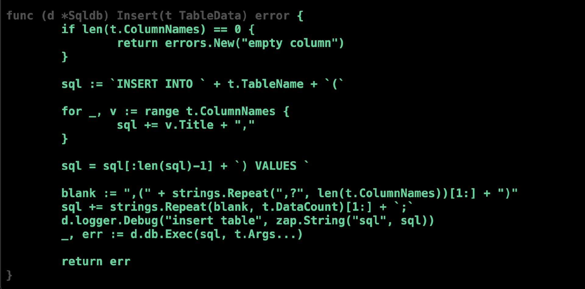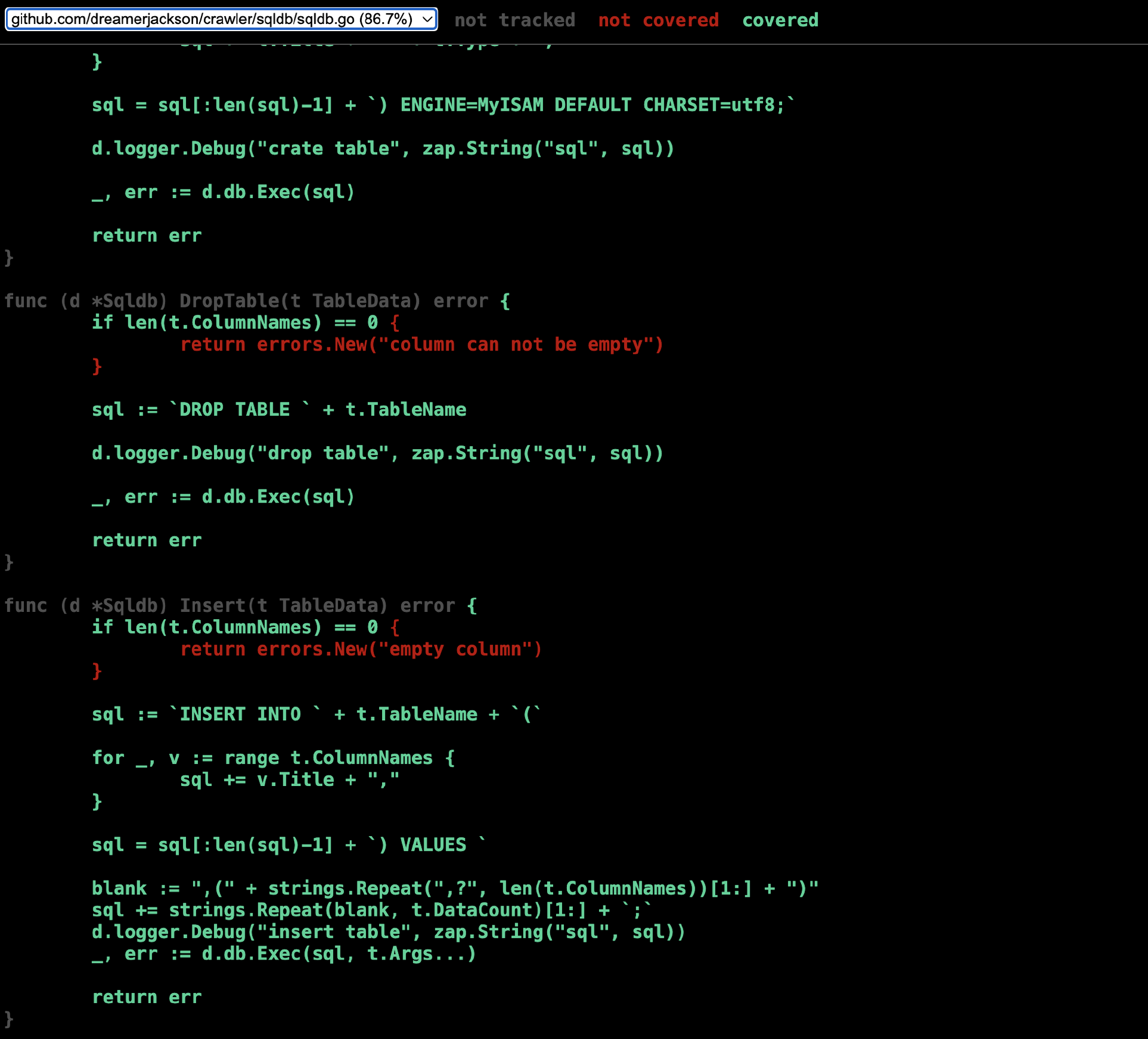 不过上面这个例子中,我们在测试用例中遗漏掉了 t.ColumnNames 为空时的判断。现在让我们优化一下测试代码,在TestSqldb_InsertTable 测试函数中加入 t.ColumnNames 为空的测试用例。