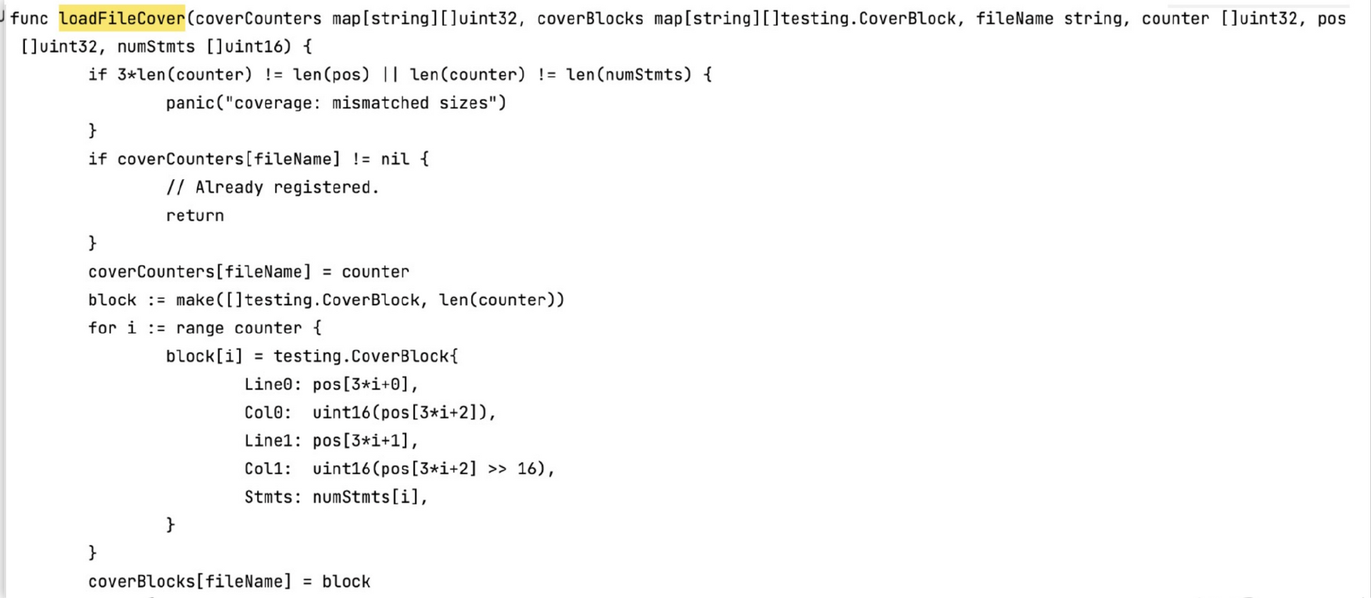 coverprofile 协议文件需要的信息可以通过 go test -cover 自动生成的代码获得。这里,我们可以参考开源库goc的实现逻辑,goc 库本身是对 go test -cover 命令的封装。借助goc build –debug得到的在临时目录生成的文件,我们可以查看到goc是如何生成 coverprofile 协议文件的,核心函数位于loadFileCover中。