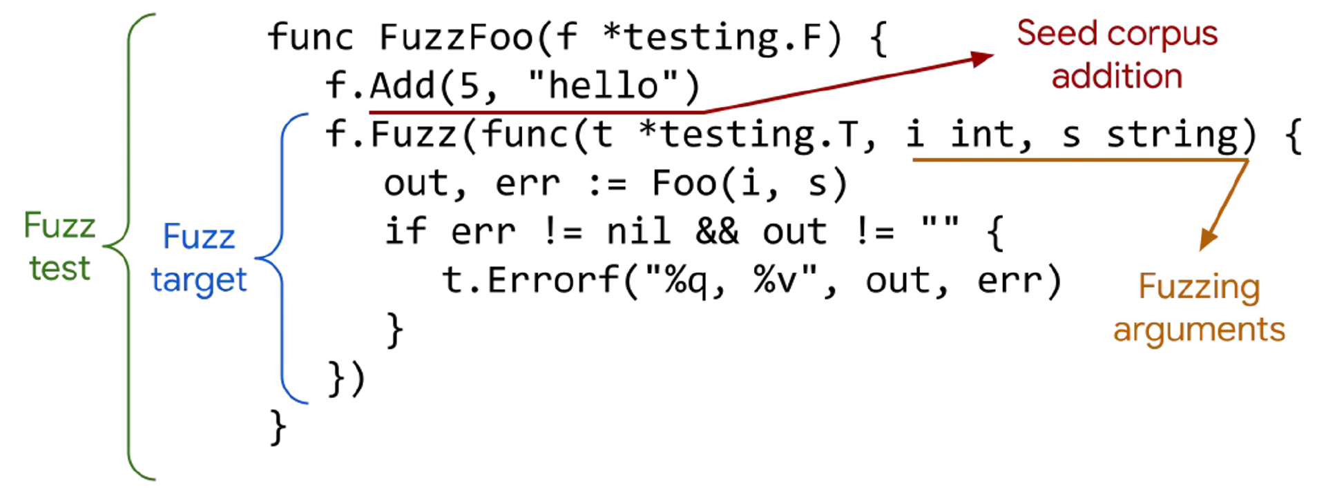 和单元测试类似,模糊测试以单词Fuzz开头,因此必须以 f *testing.F 为参数。而且和单元测试被称为Unit Test类似,模糊测试也被称为Fuzz Test。
