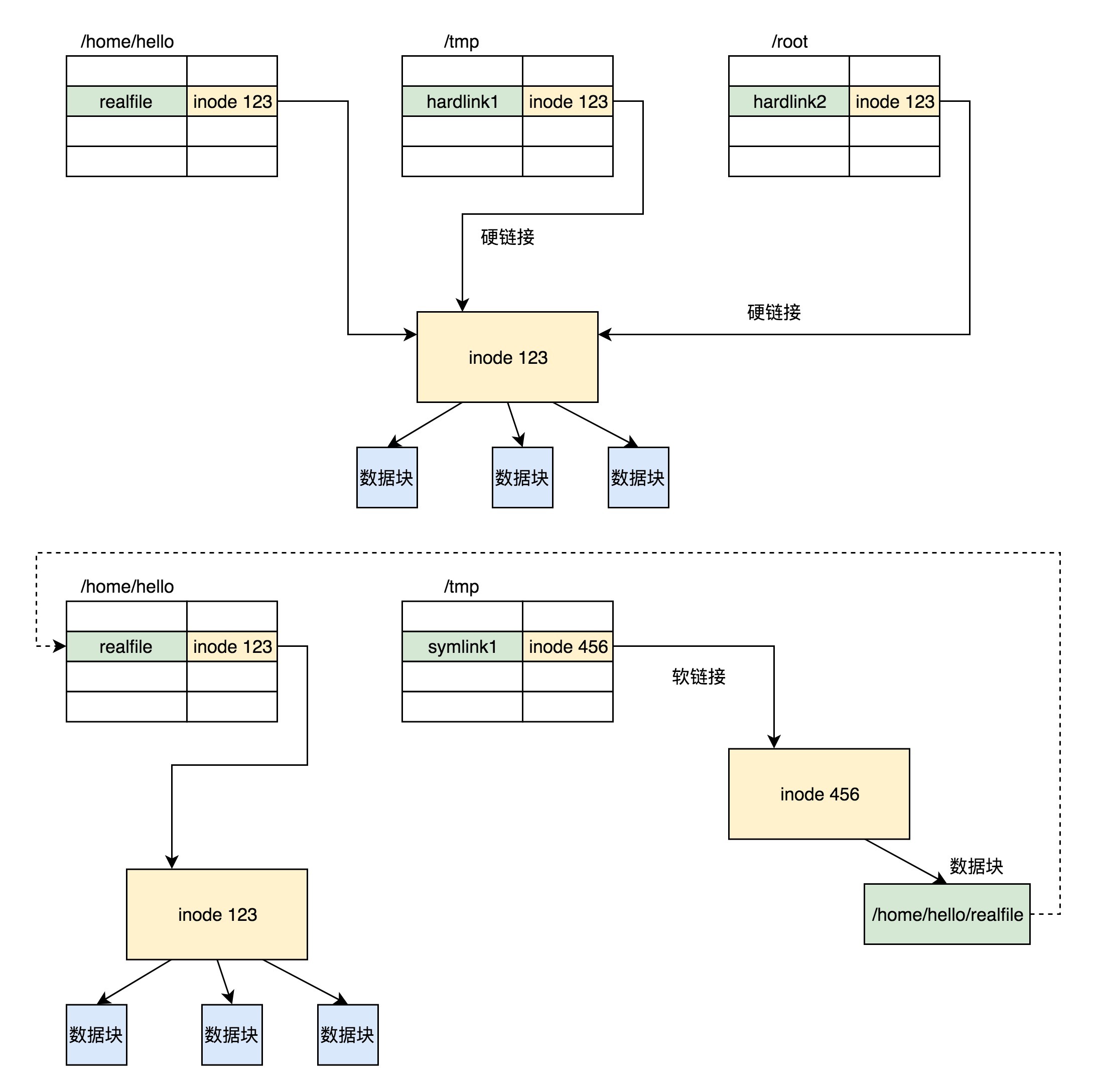 ln -s创建的是软链接,不带-s创建的是硬链接。它们有什么区别呢?在文件系统里面是怎么保存的呢?