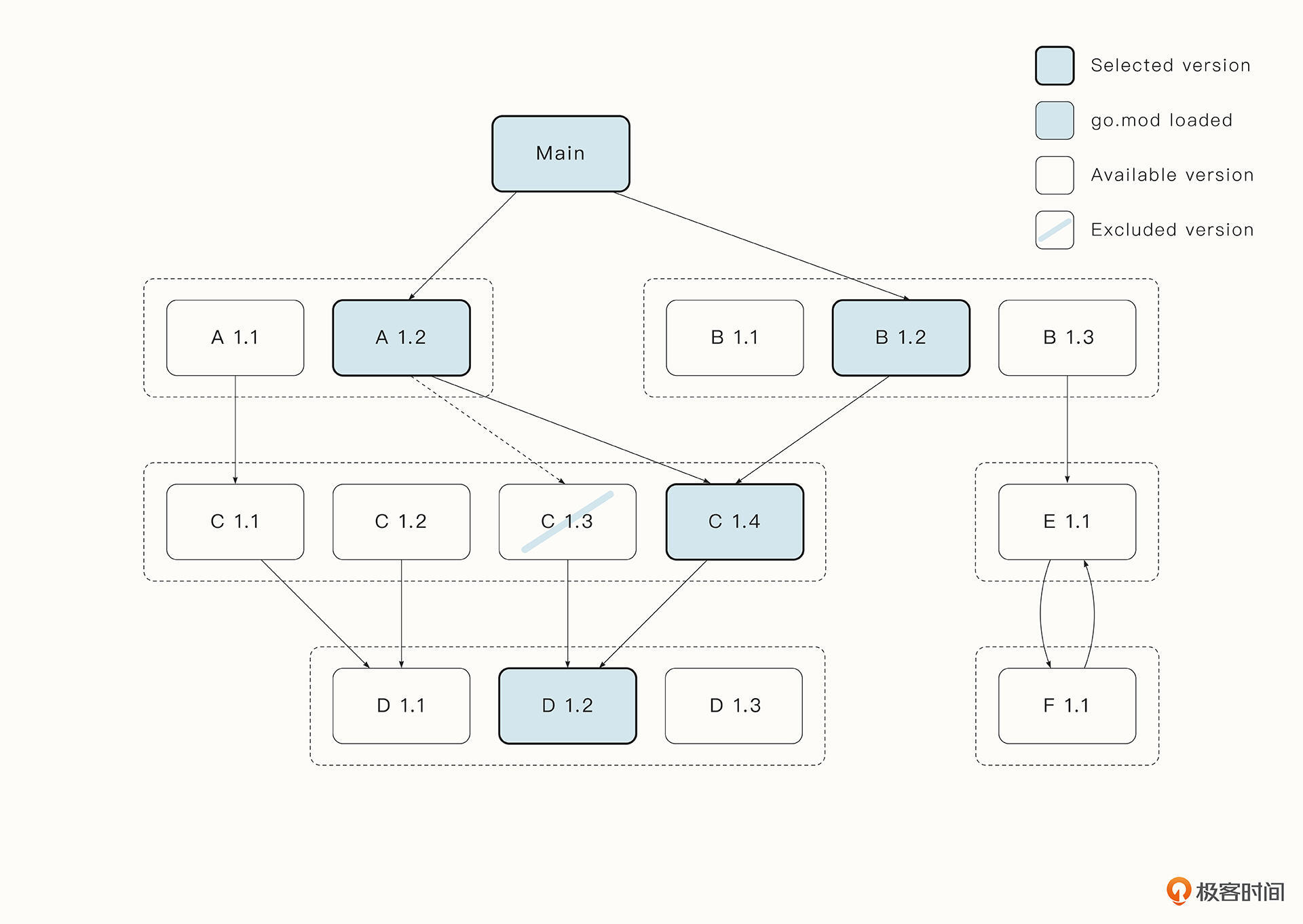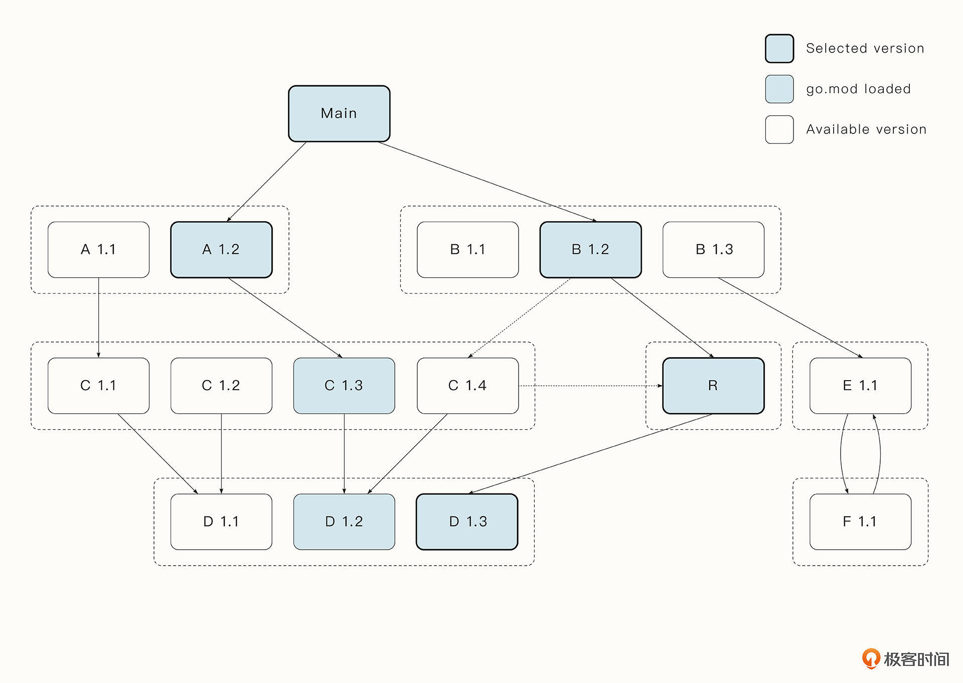明白了Go Modules的使用方法,接下来我们来看一看Go Modules在复杂情况下的版本选择原理。
