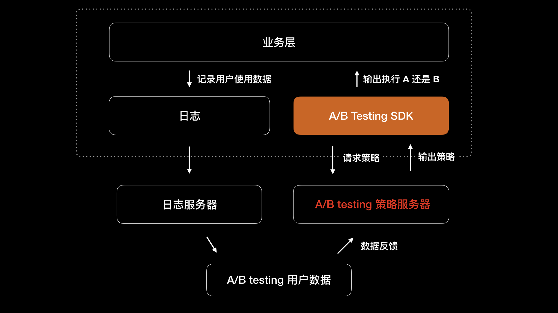 其中,策略服务包含了决策流程、策略维度。A/B测试 SDK 将用户放在不同测试桶里,测试桶可以按照系统信息、地址位置、发布渠道等来划分。日志系统和策略服务,主要是用作服务端处理的,这里我就不再展开了。