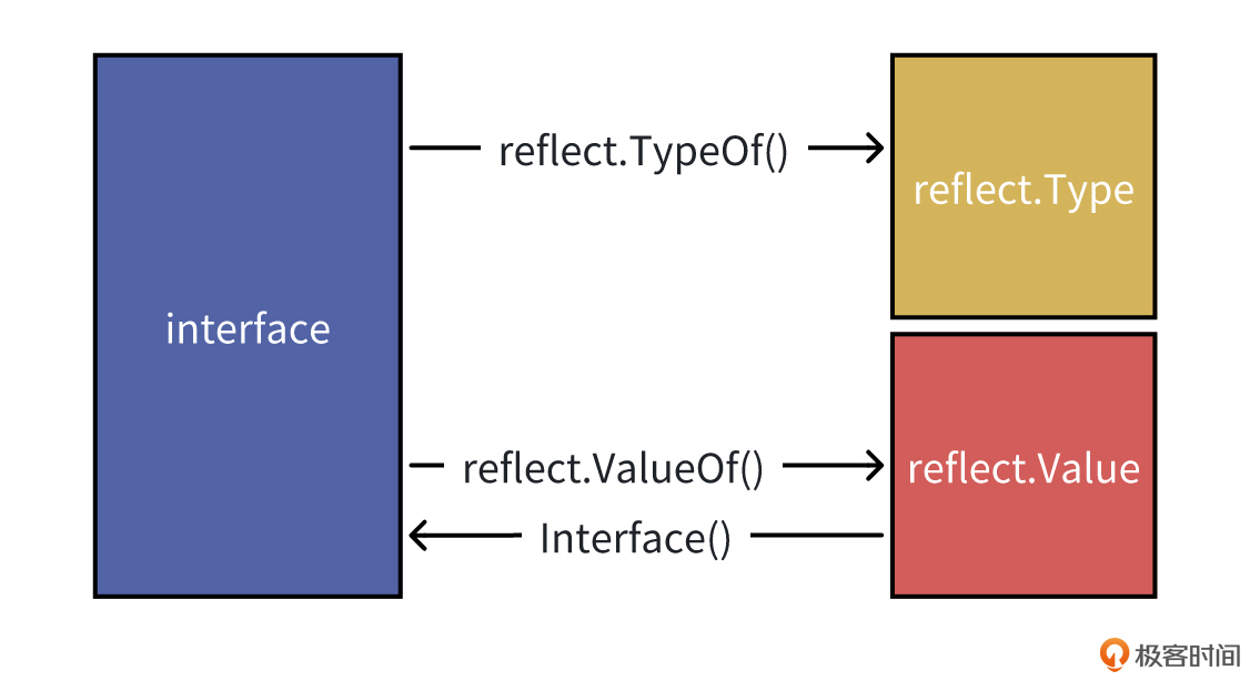 首先是**对象类型转换功能。**正如下面的图所示,我们可以通过 TypeOf 和 ValueOf 方法将 interface{} 类型的变量转换为反射类型对象 Type 和 Value。同样,通过 Interface 方法,我们可以将 Value 对象转换回 interface{} 类型的变量。